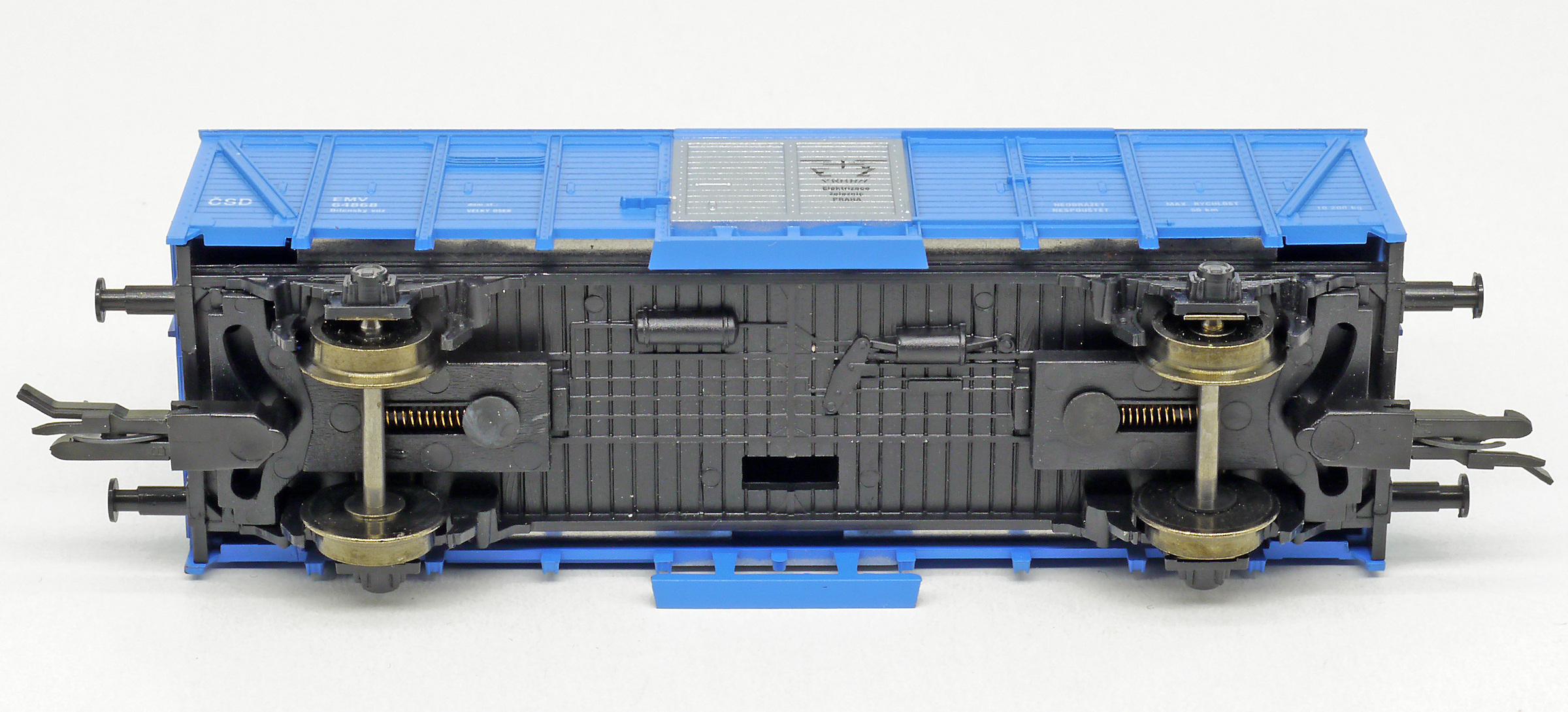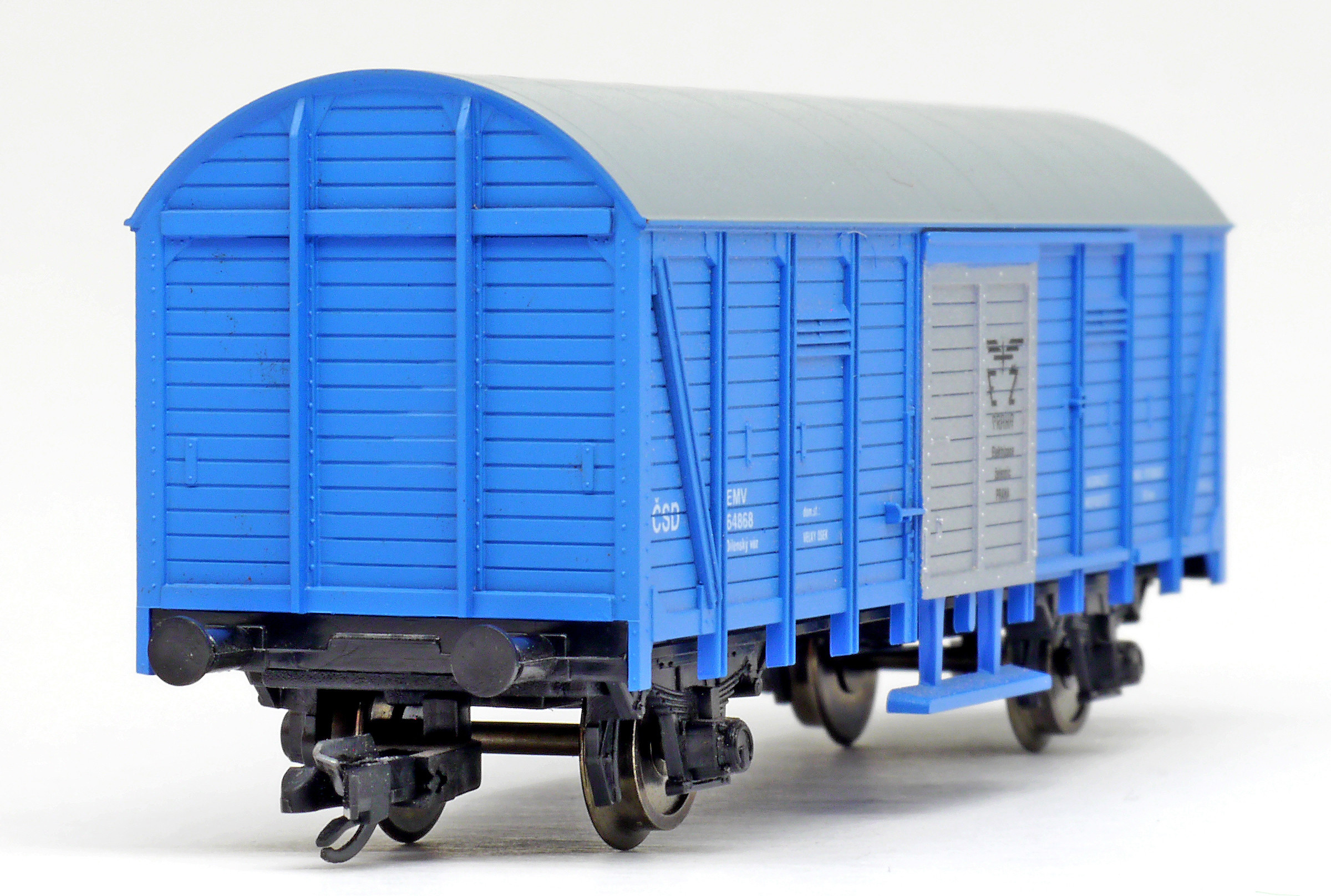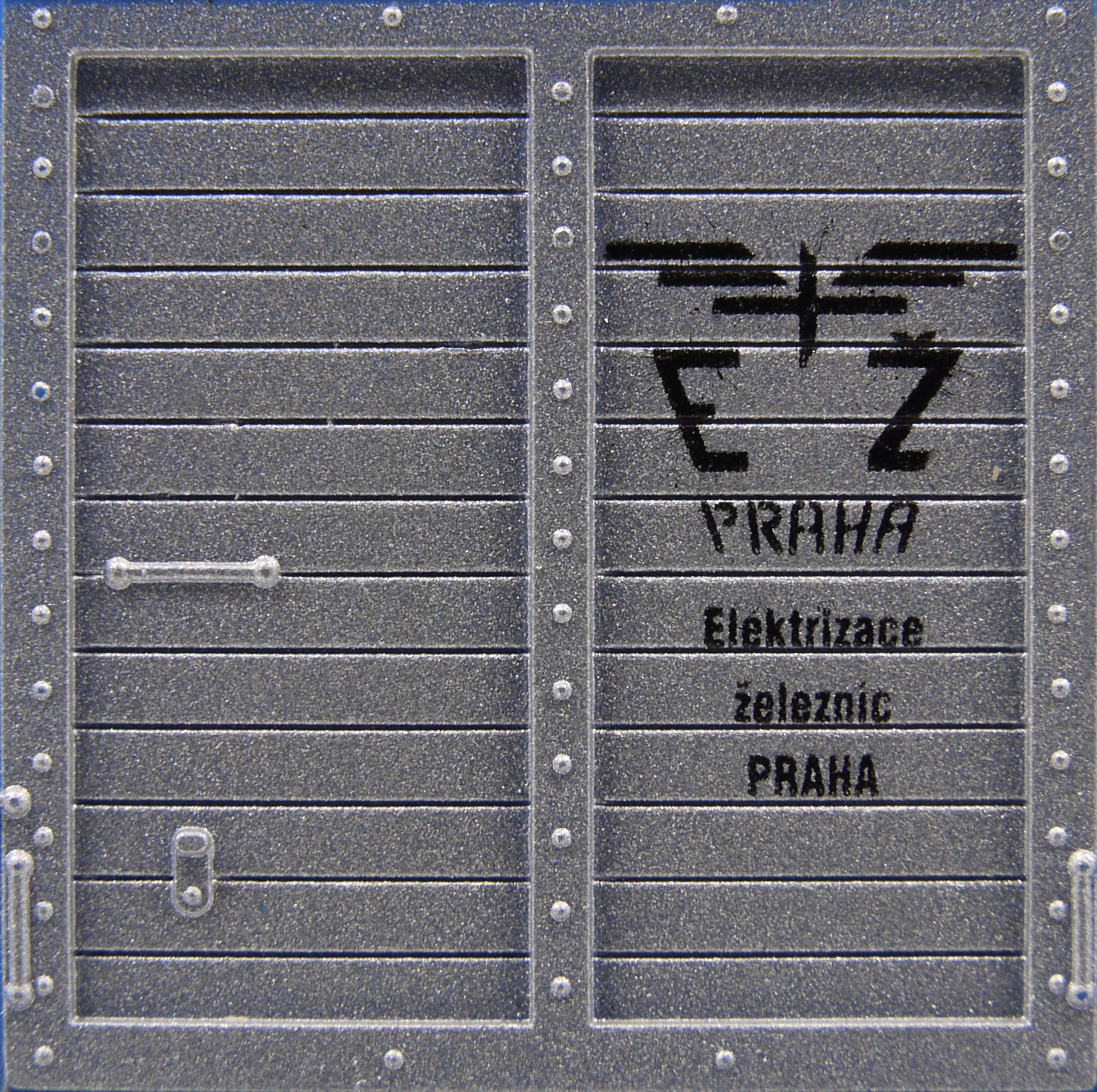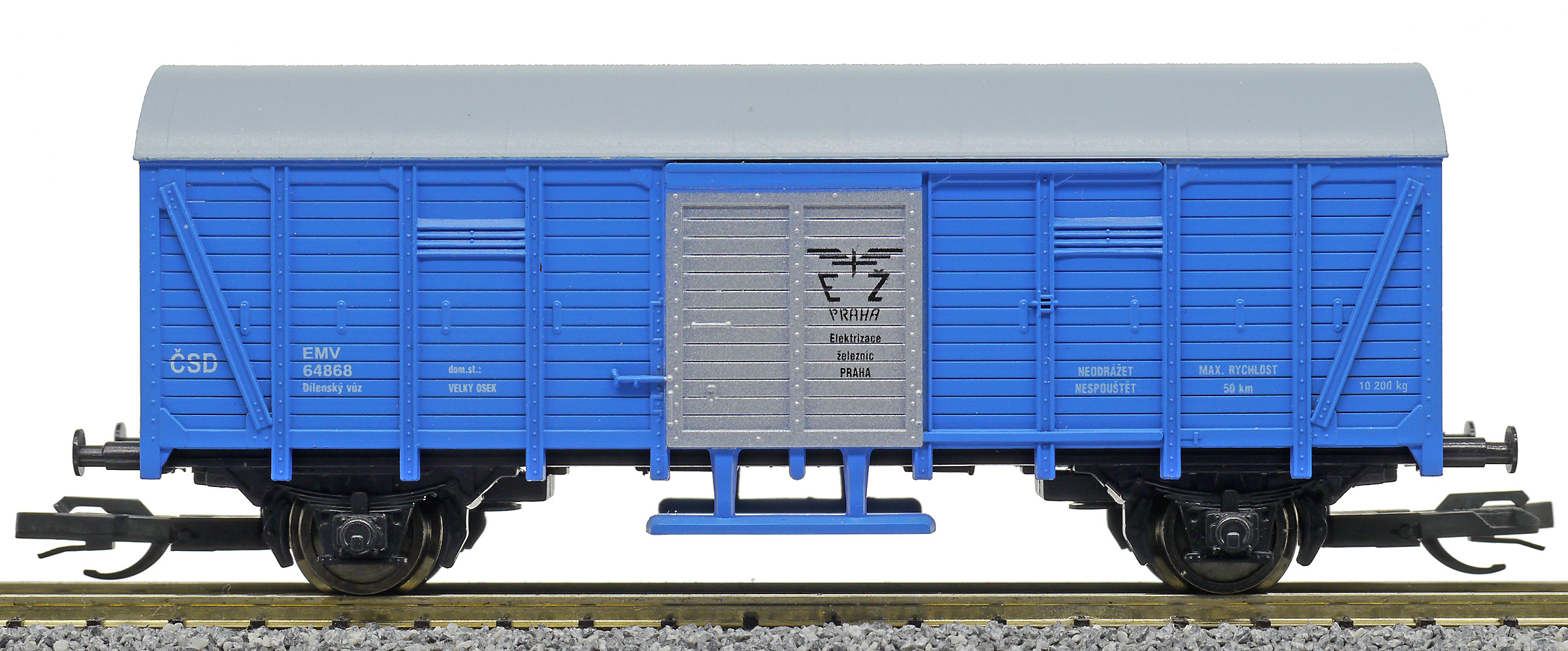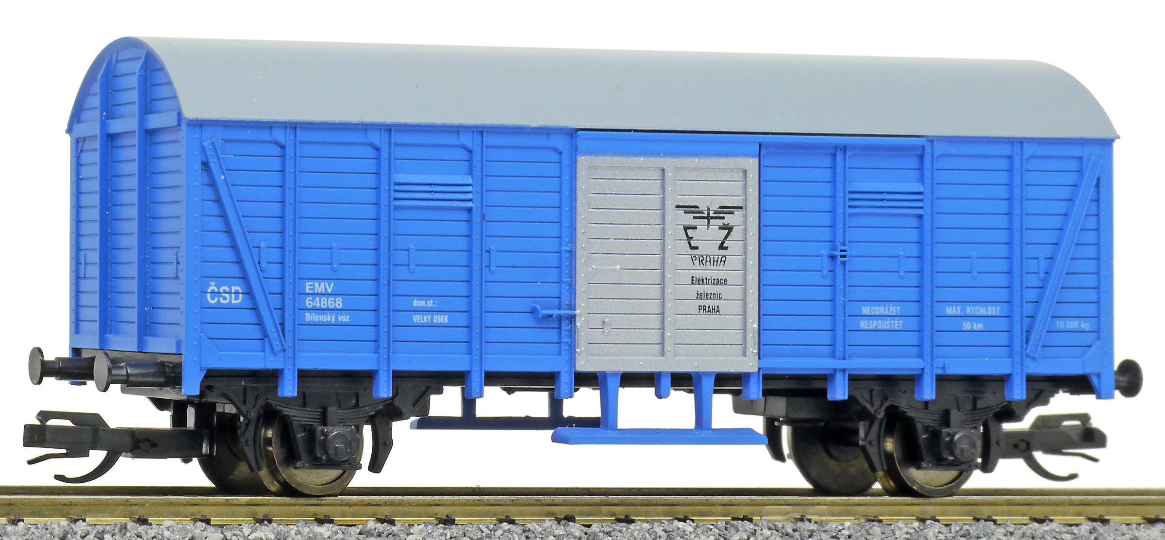 | krytý nákladní vůz modrý s šedou střechou a stříbrnými vraty dílenský vůz „Elektrizace železnic“ |