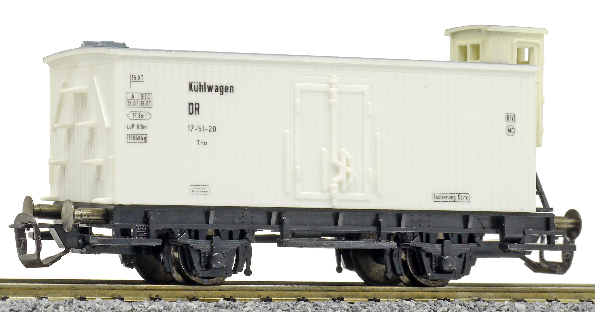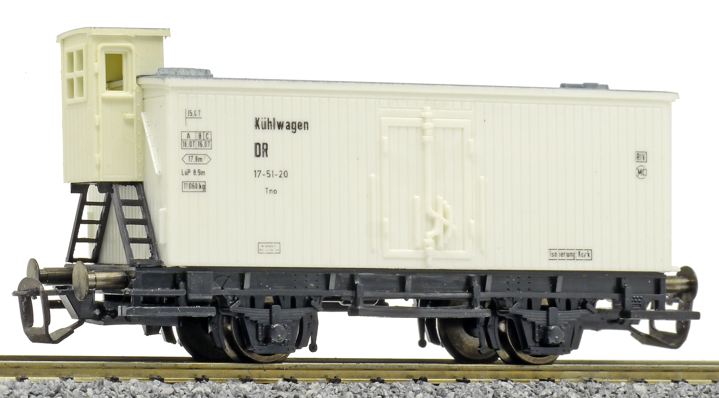 | nákladní chladící vůz bílý s šedou střechou a brzdařskou budkou |