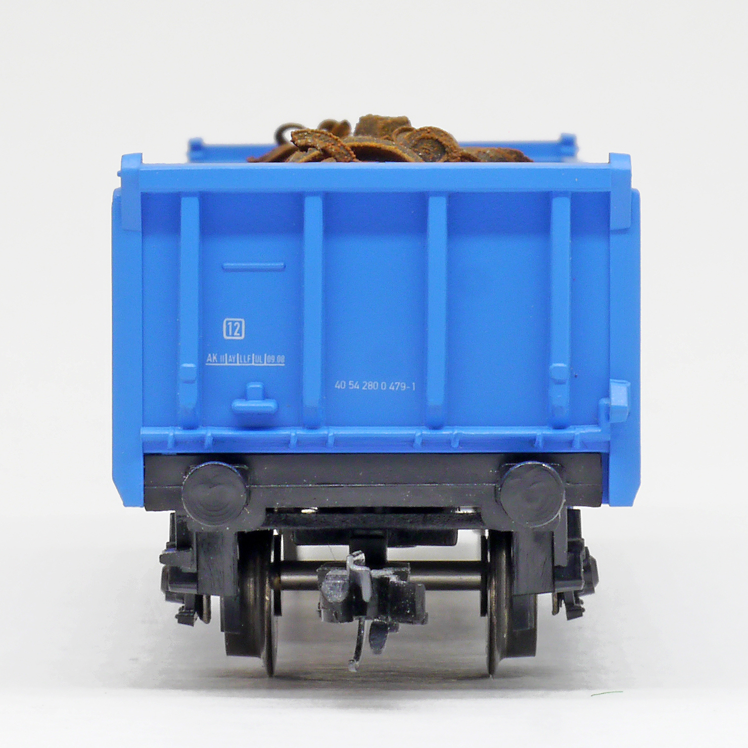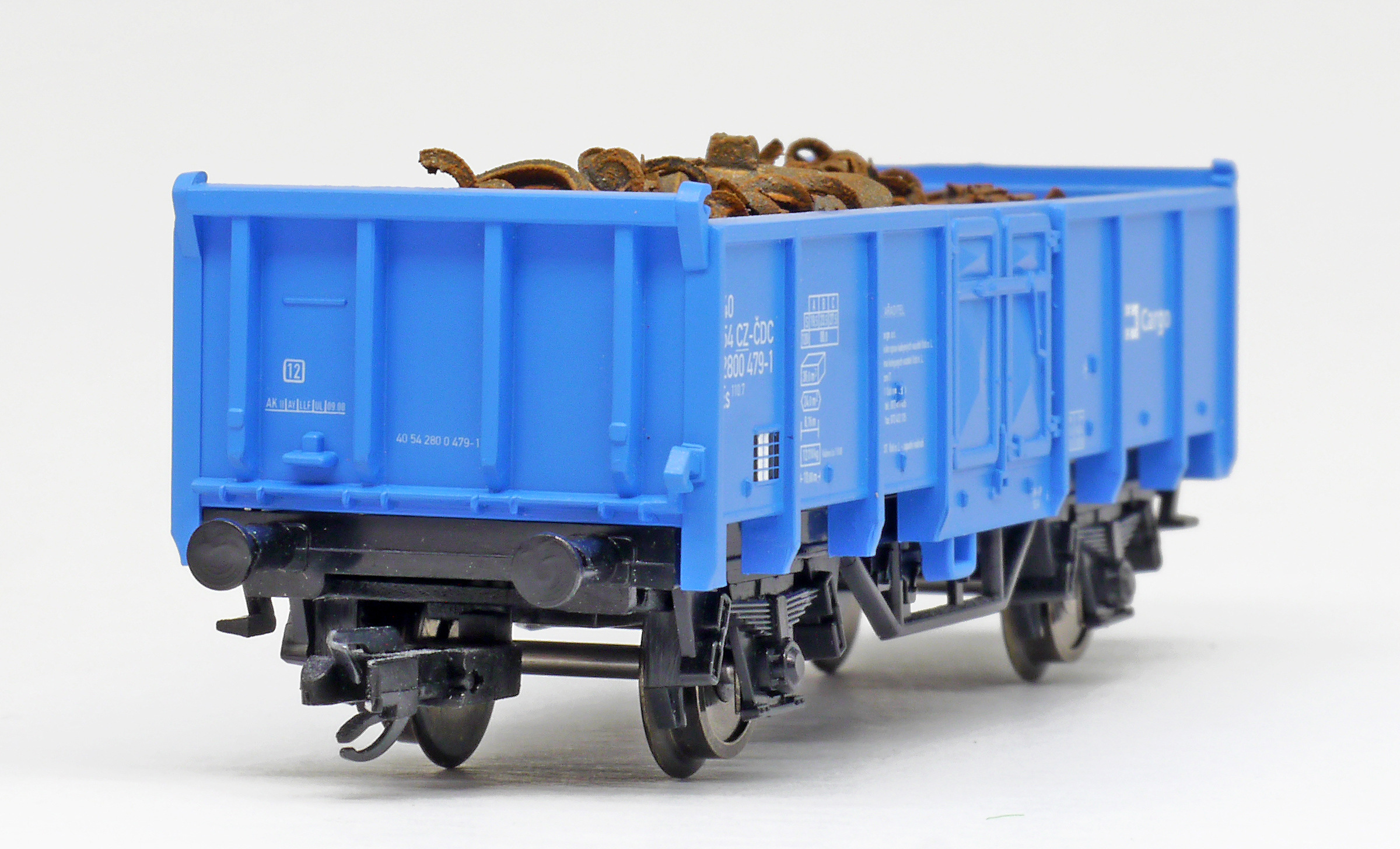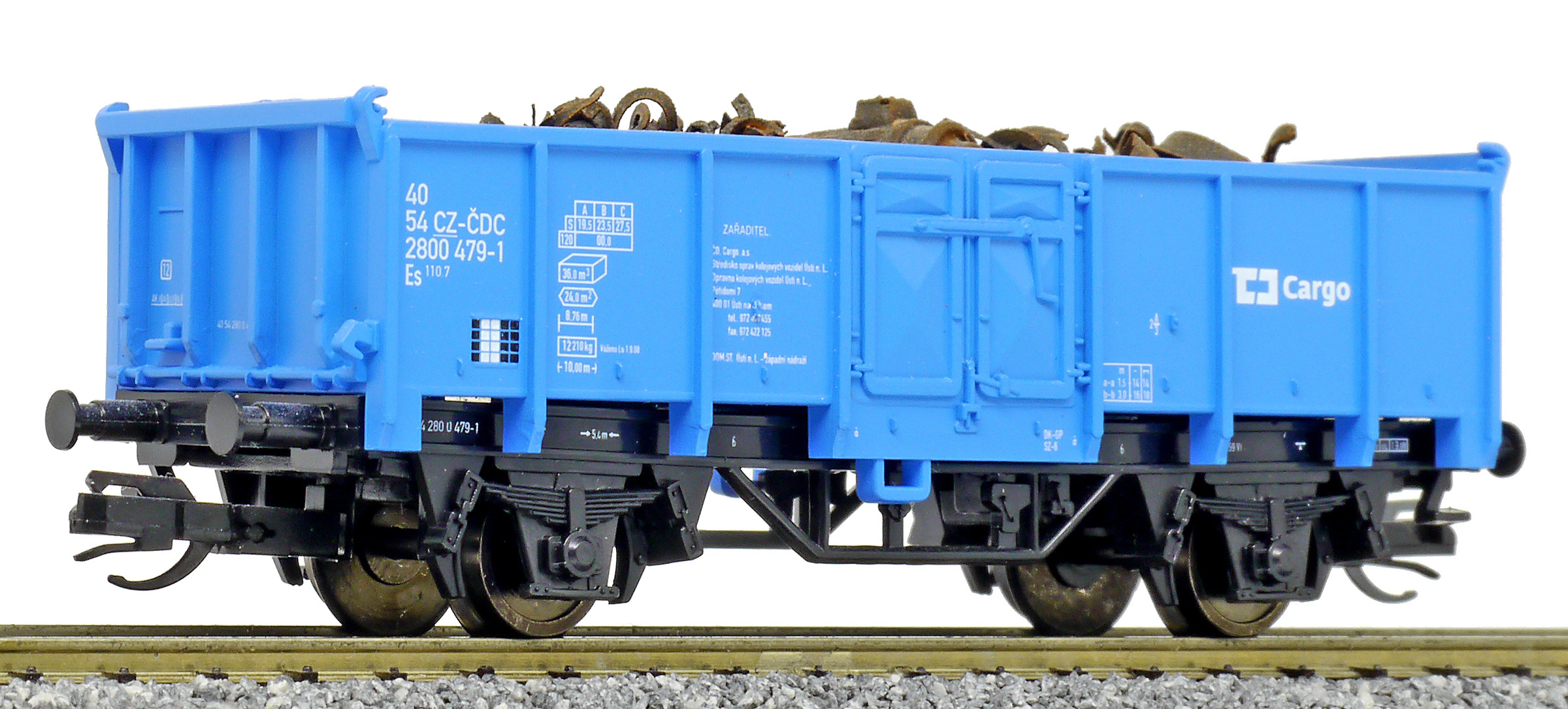 | otevřený nákladní vůz modrý ložený šrotem |
