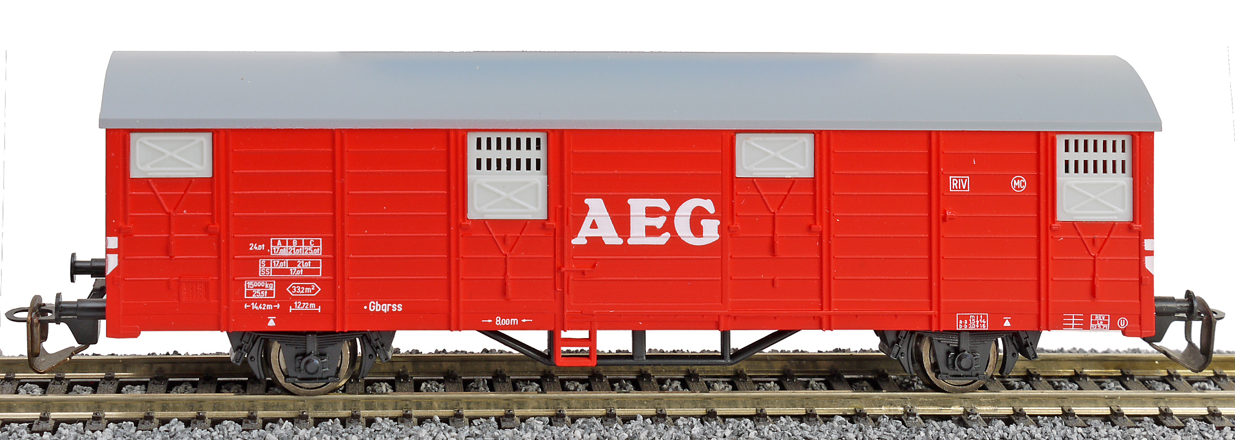 | krytý nákladní vůz červený s šedou střechou „AEG“ |