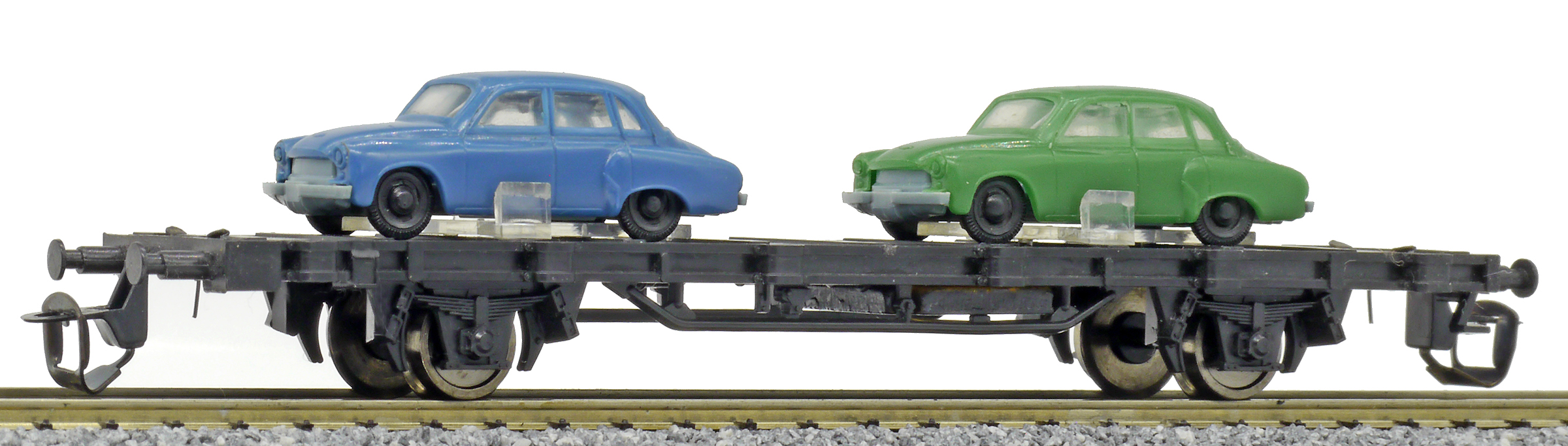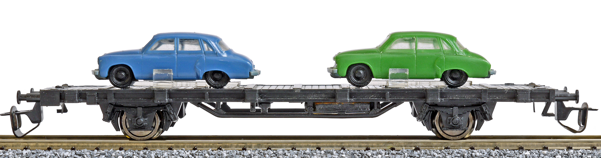 Popis   plošinový nákladní vůz černý s nákladem dvou osobních automobilů Wartburg