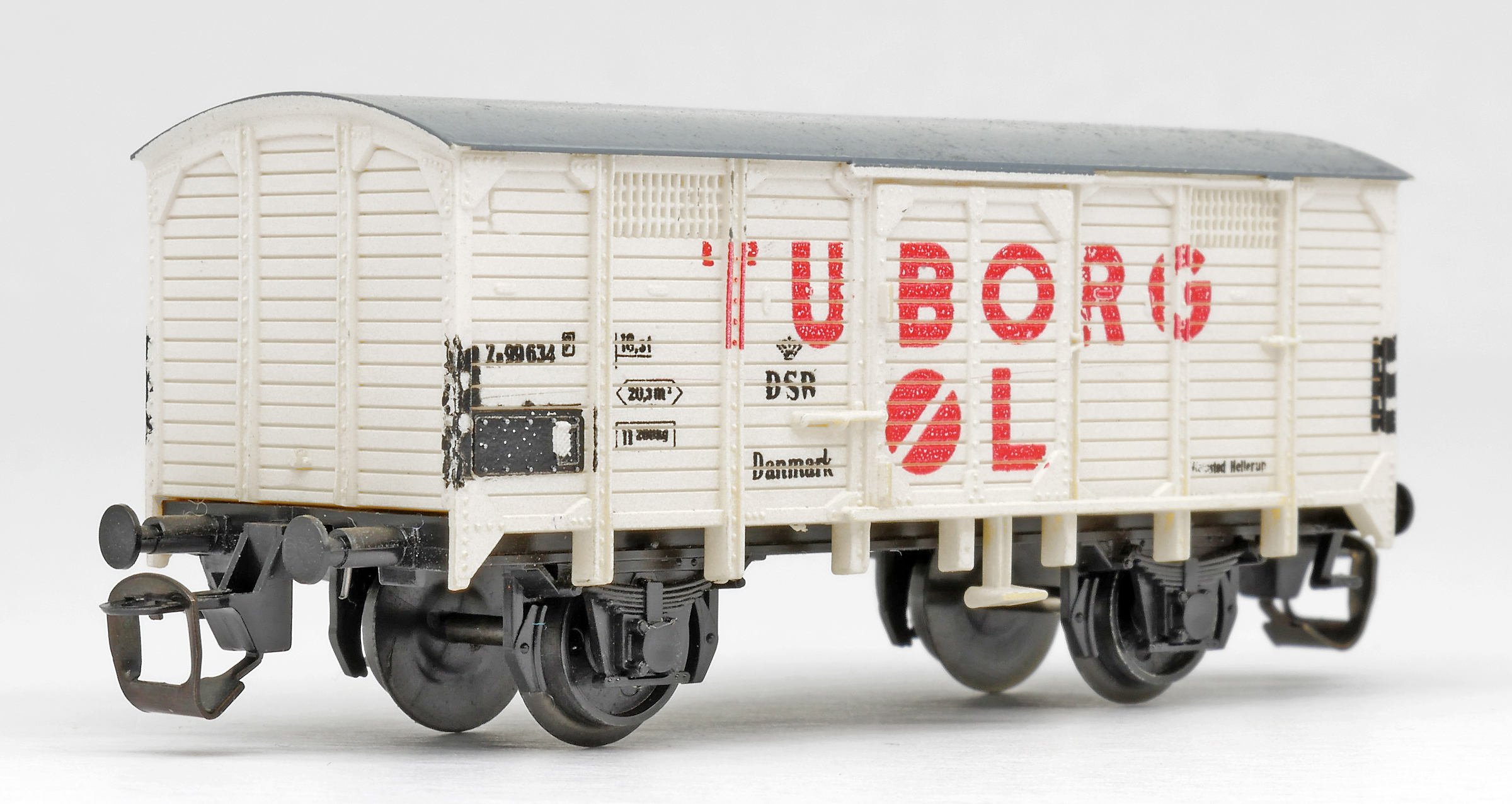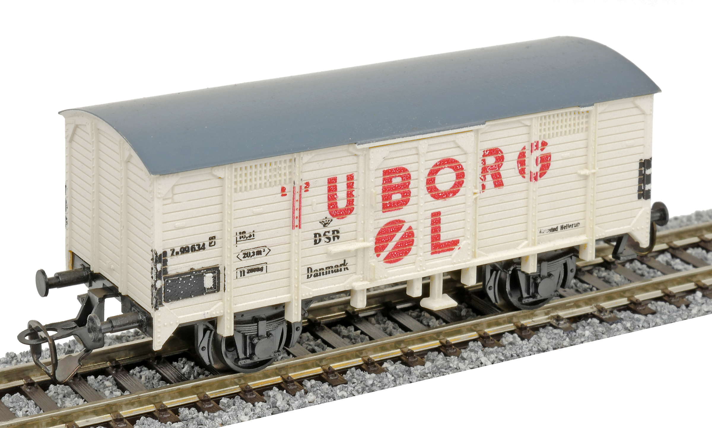 krytý nákladní vůz bílý s šedou střechou „TUBORG ØL“