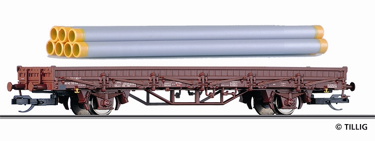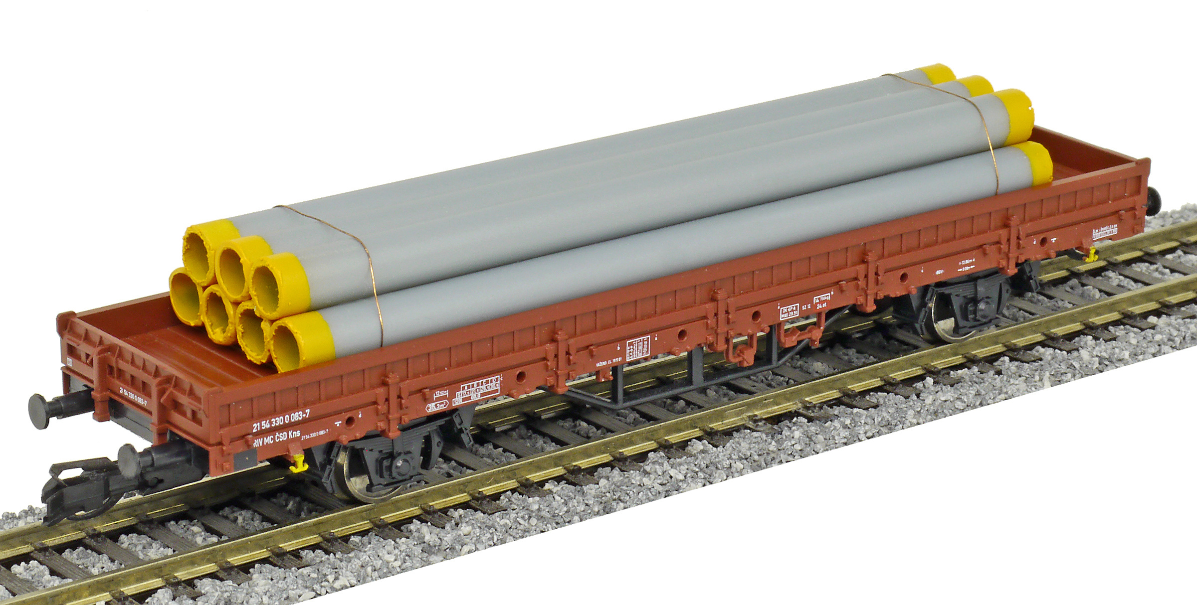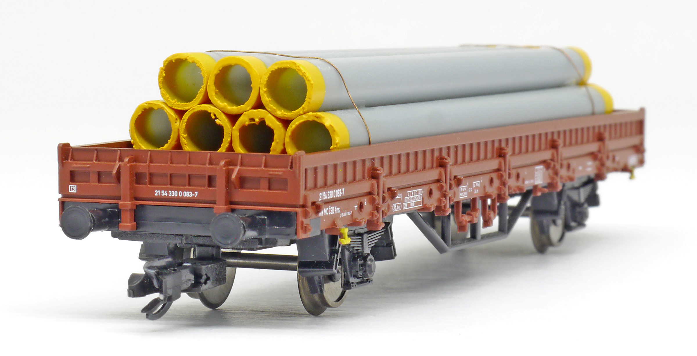 | nízkostěnný nákladní vůz červenohnědý s nákladem rour |