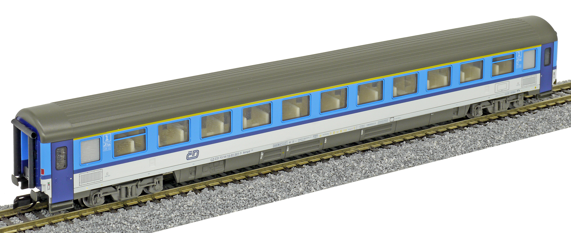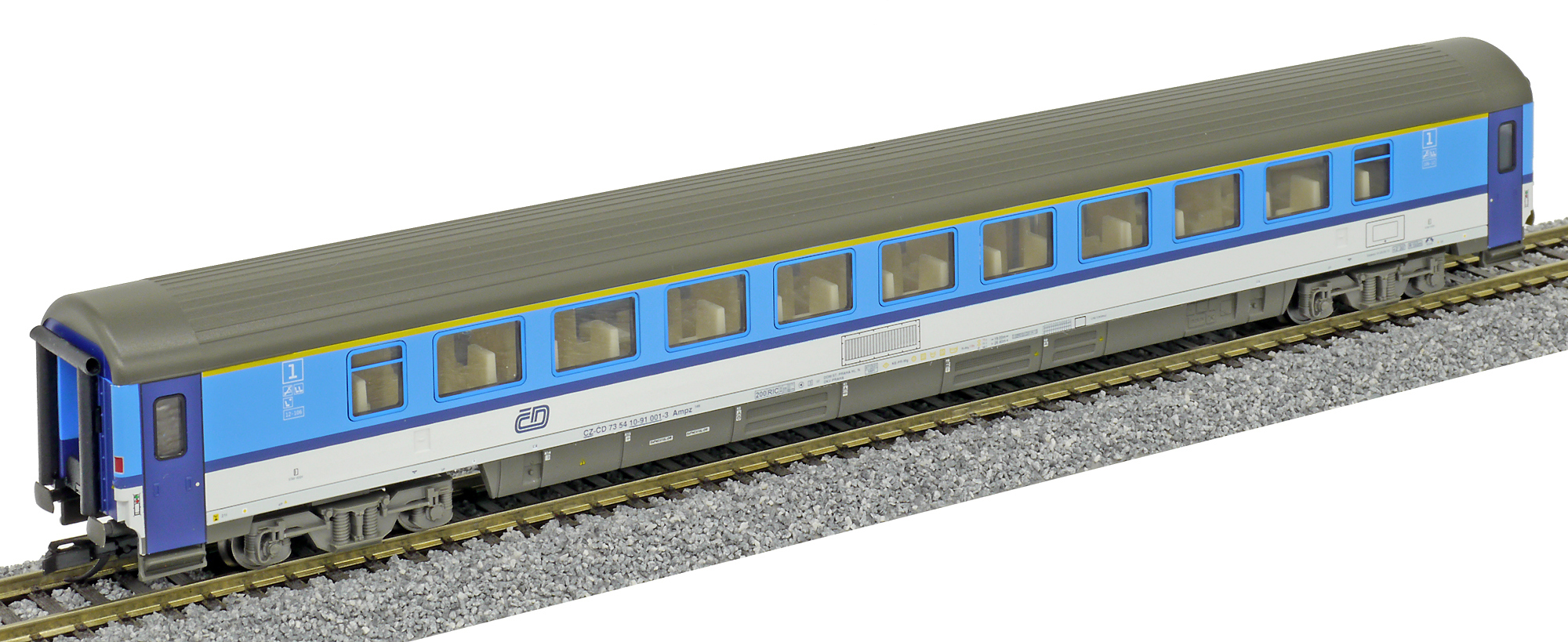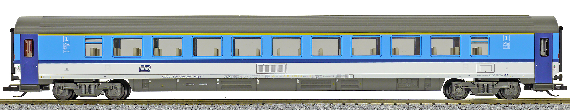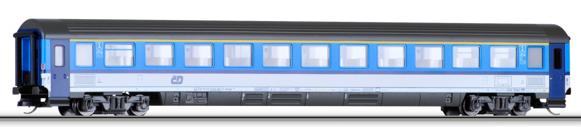 rychlíkový vůz v barevném schematu „Najbrt“ 1. tř.