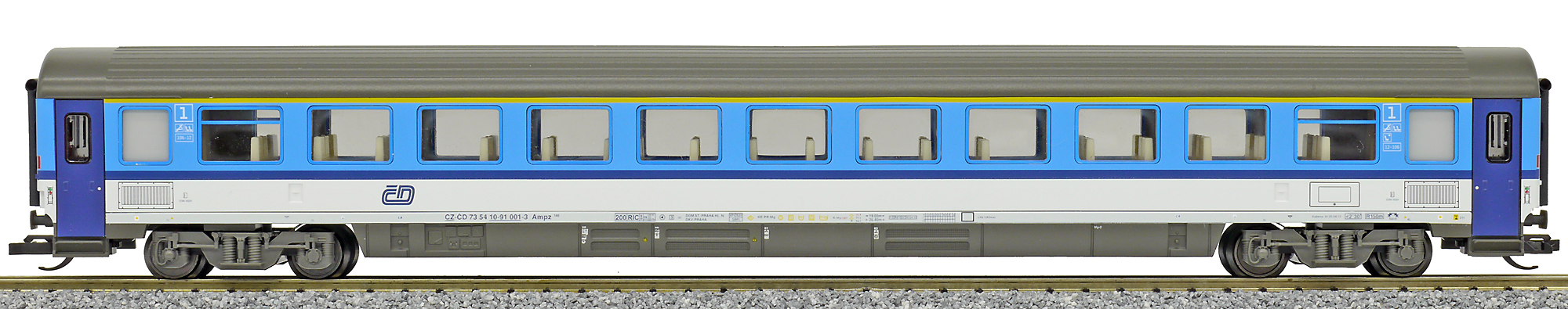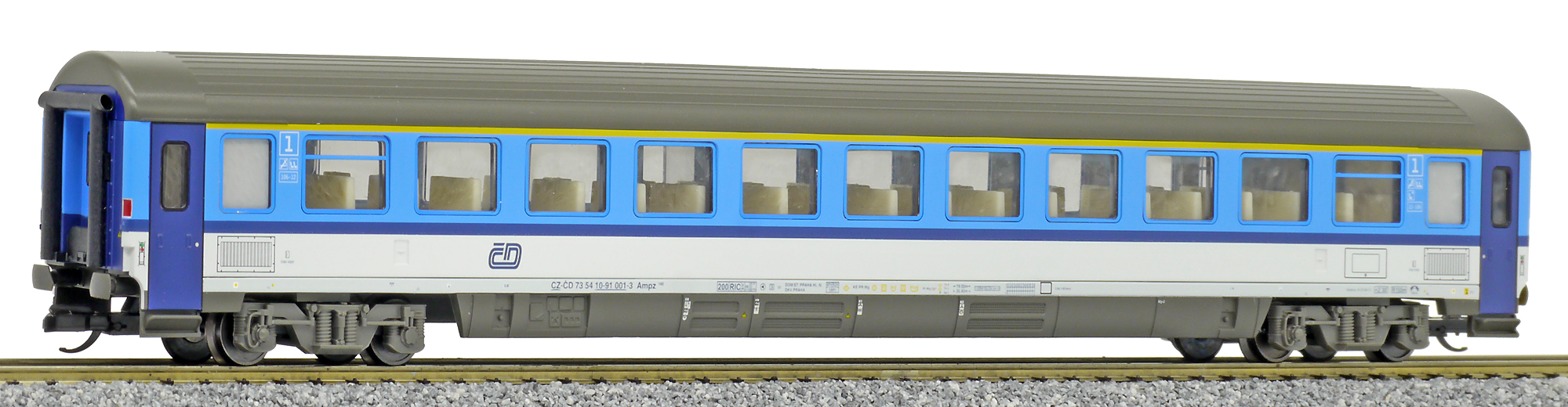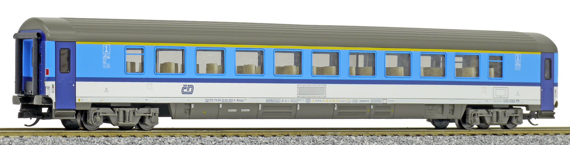 rychlíkový vůz v barevném schematu „Najbrt“ 1. tř.
