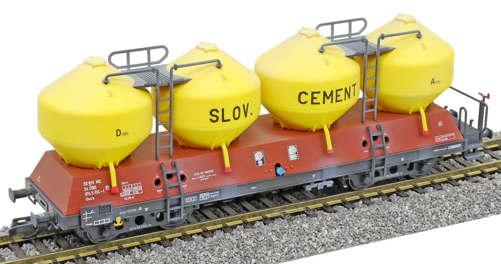 | nákladní samovýsypný vůz červenohnědý se žlutými nádobami „SLOV. CEMENT“ |