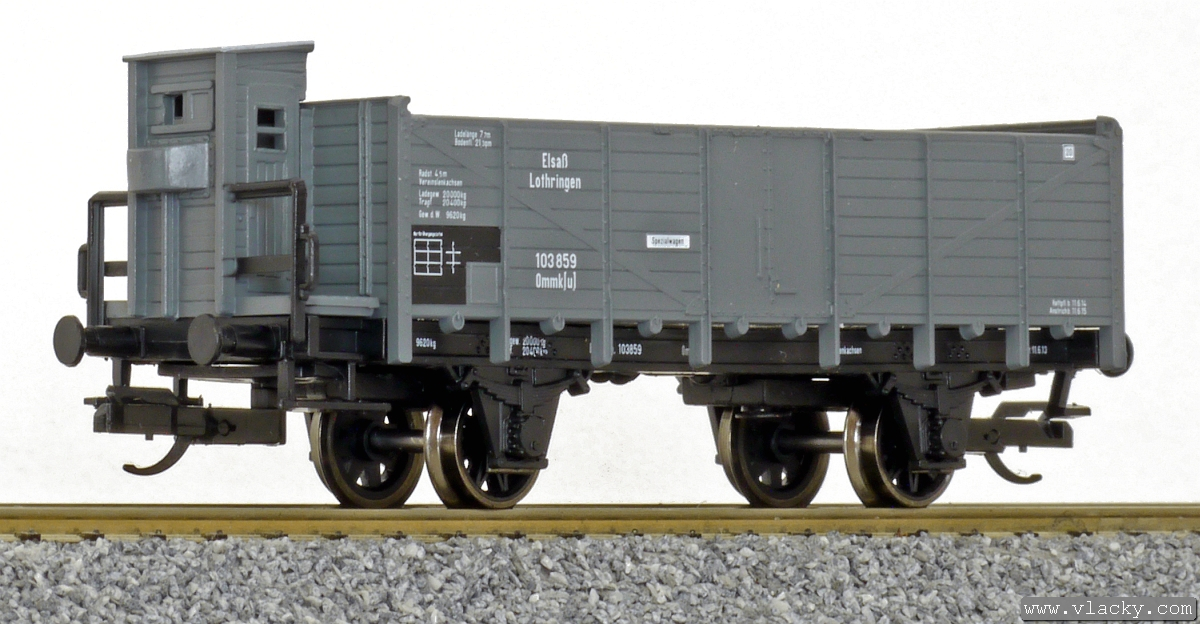 | otevřený vůz šedý s loukoťovými koly a s brzdařskou budkou |