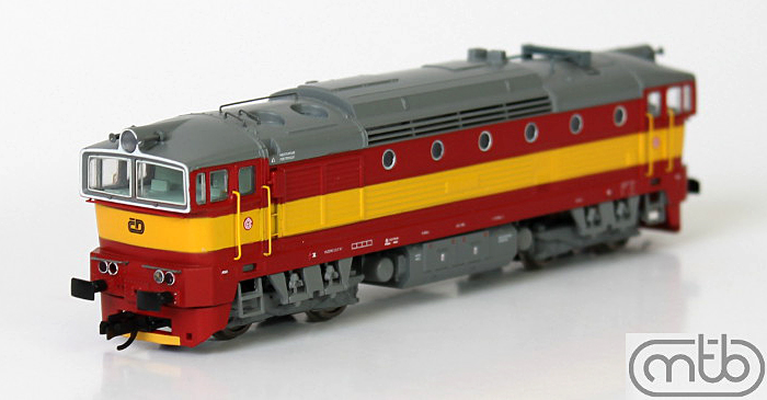 Popis   dieselová lokomotiva červená se žlutým pásem, šedá střecha