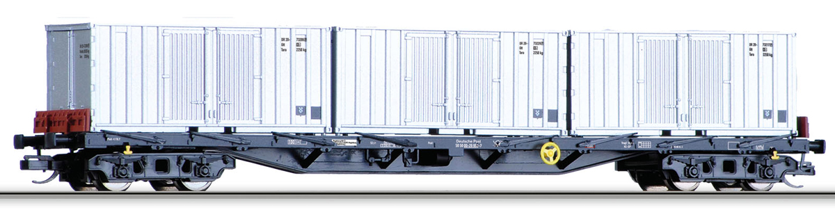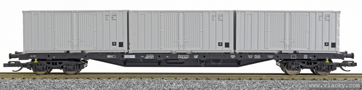 nákladní plošinový vůz černý se třemi kontejnery 20' s bočními dveřmi