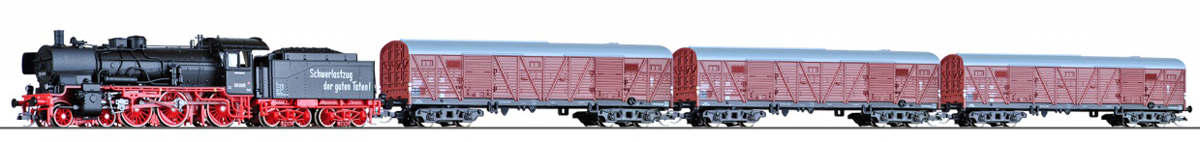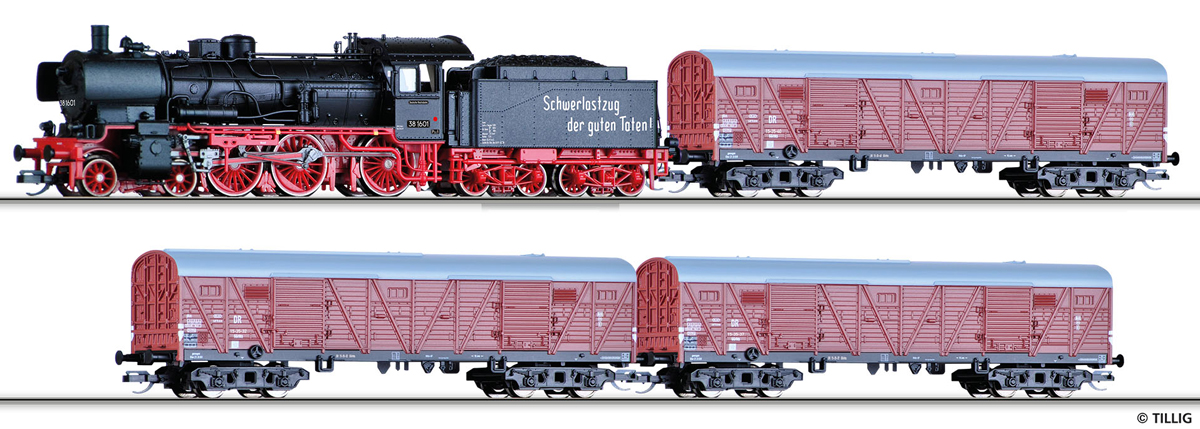 Popis   set parní lokomotivy BR 38 a tří nákladních krytých vozů