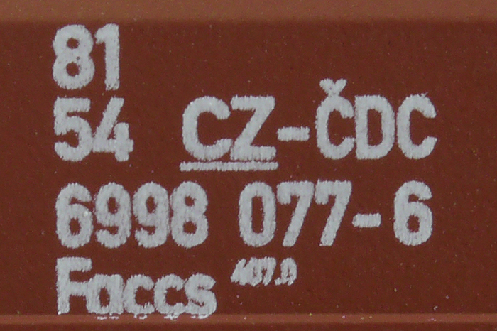 | • 81 54 6998 077-6 | → | nákladní, s podvozky, ve vlastnictví železniční správy, pro mezinárodní dopravu dle zvláštních umluv |