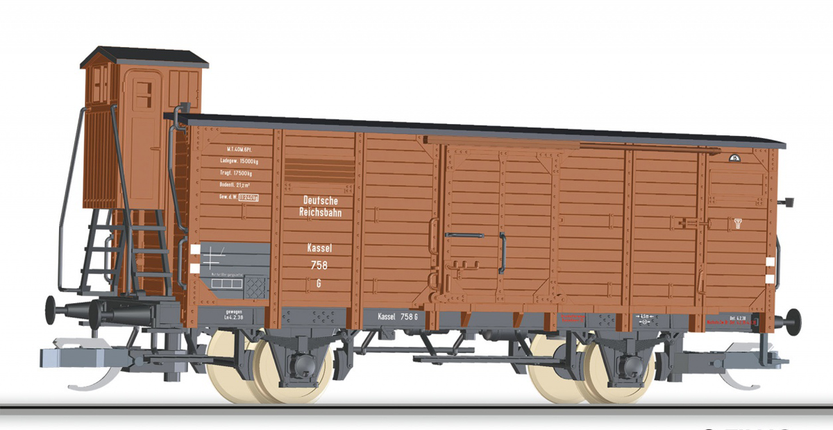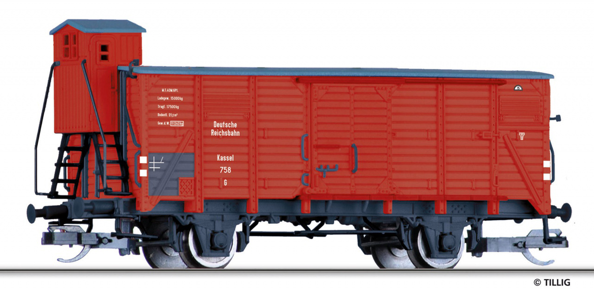 krytý nákladní vůz červenohnědý s brzdařskou budkou