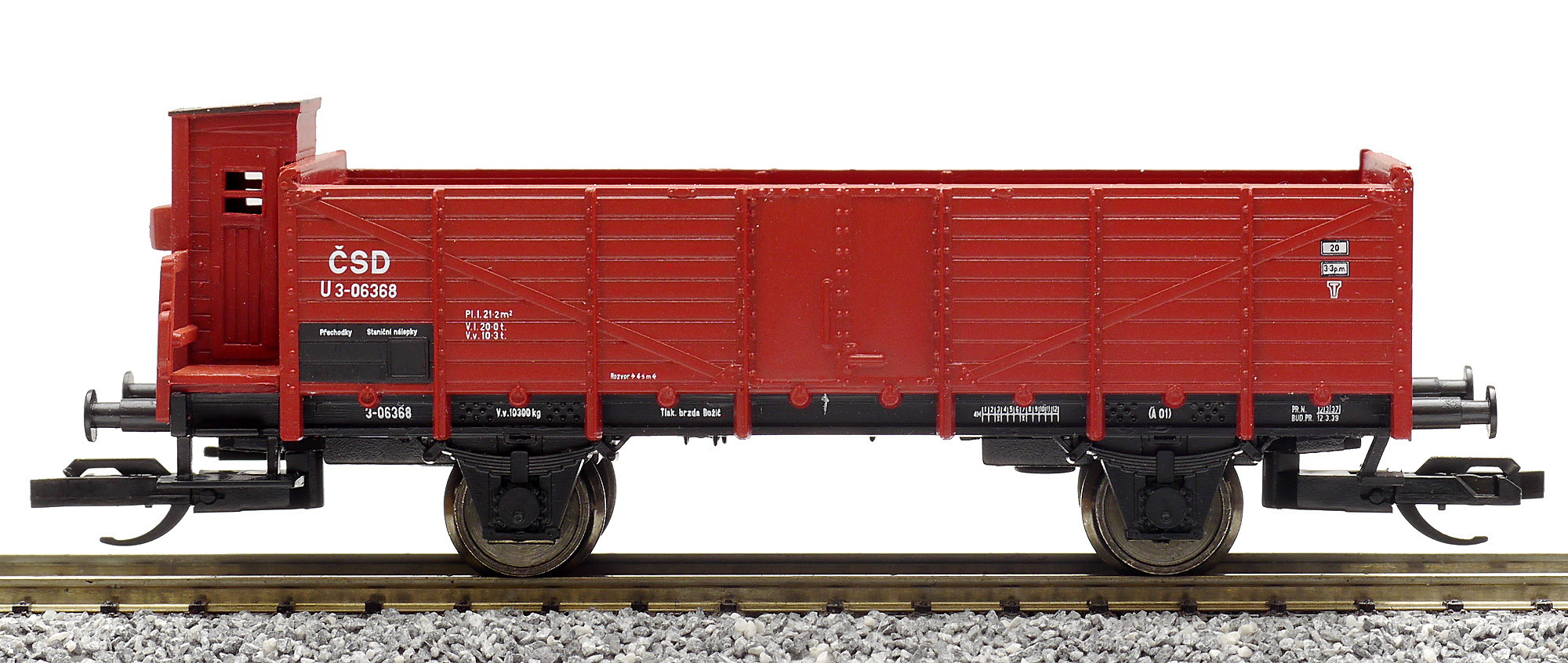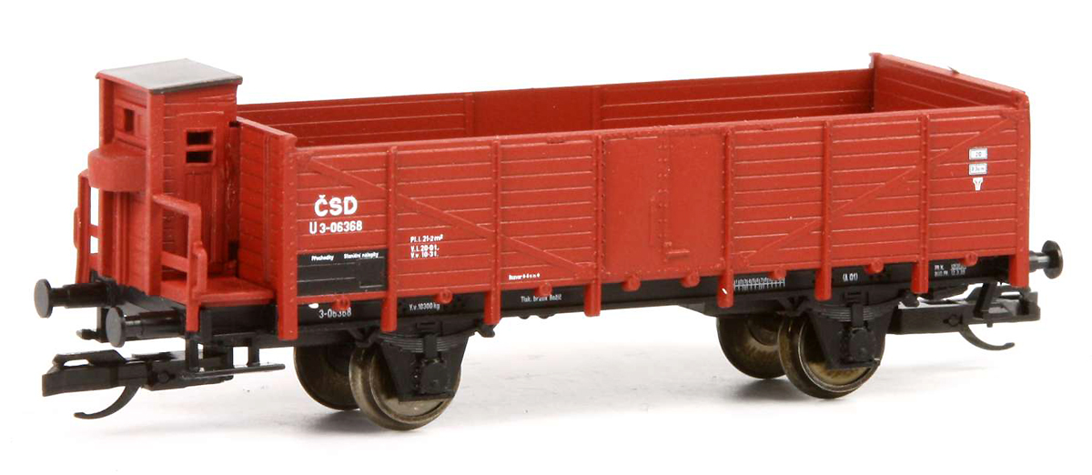 | otevřený nákladní vůz červenohnědý s brzdařskou budkou |