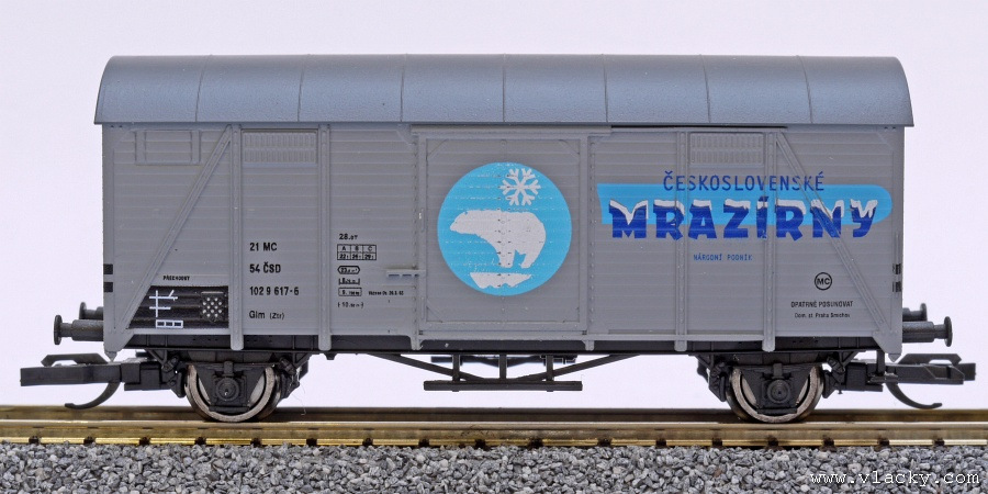 | krytý nákladní vůz šedý s tmavěšedou střechou „Československé mrazírny”, logo medvěd |