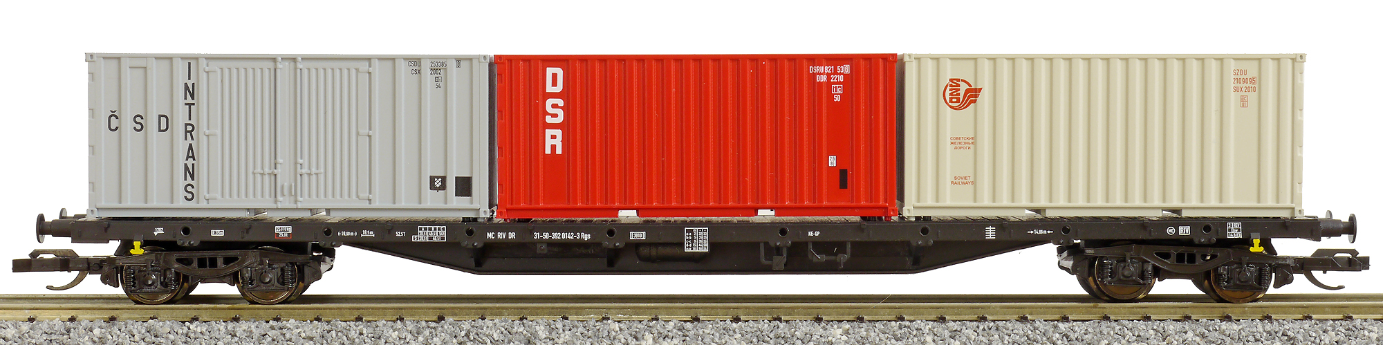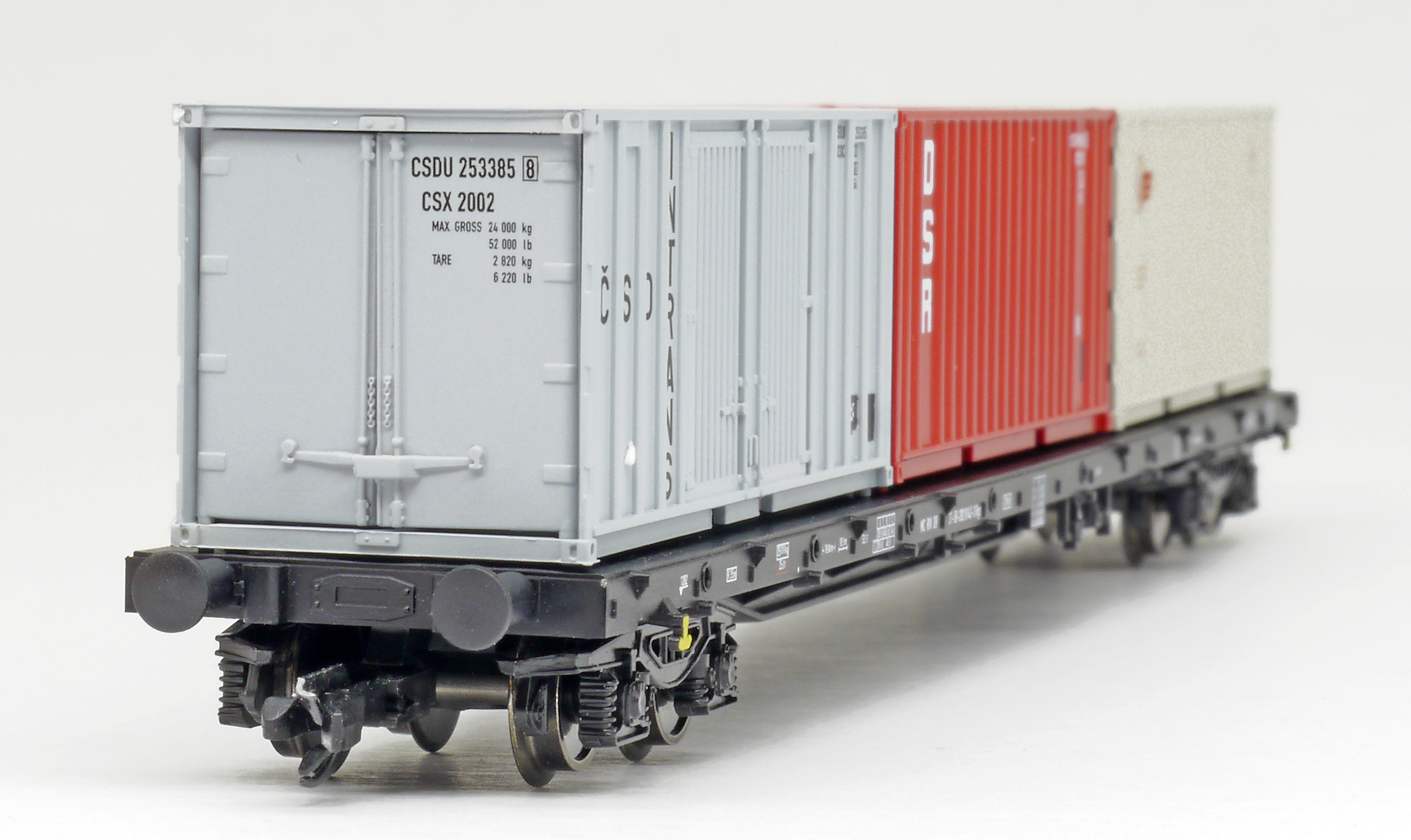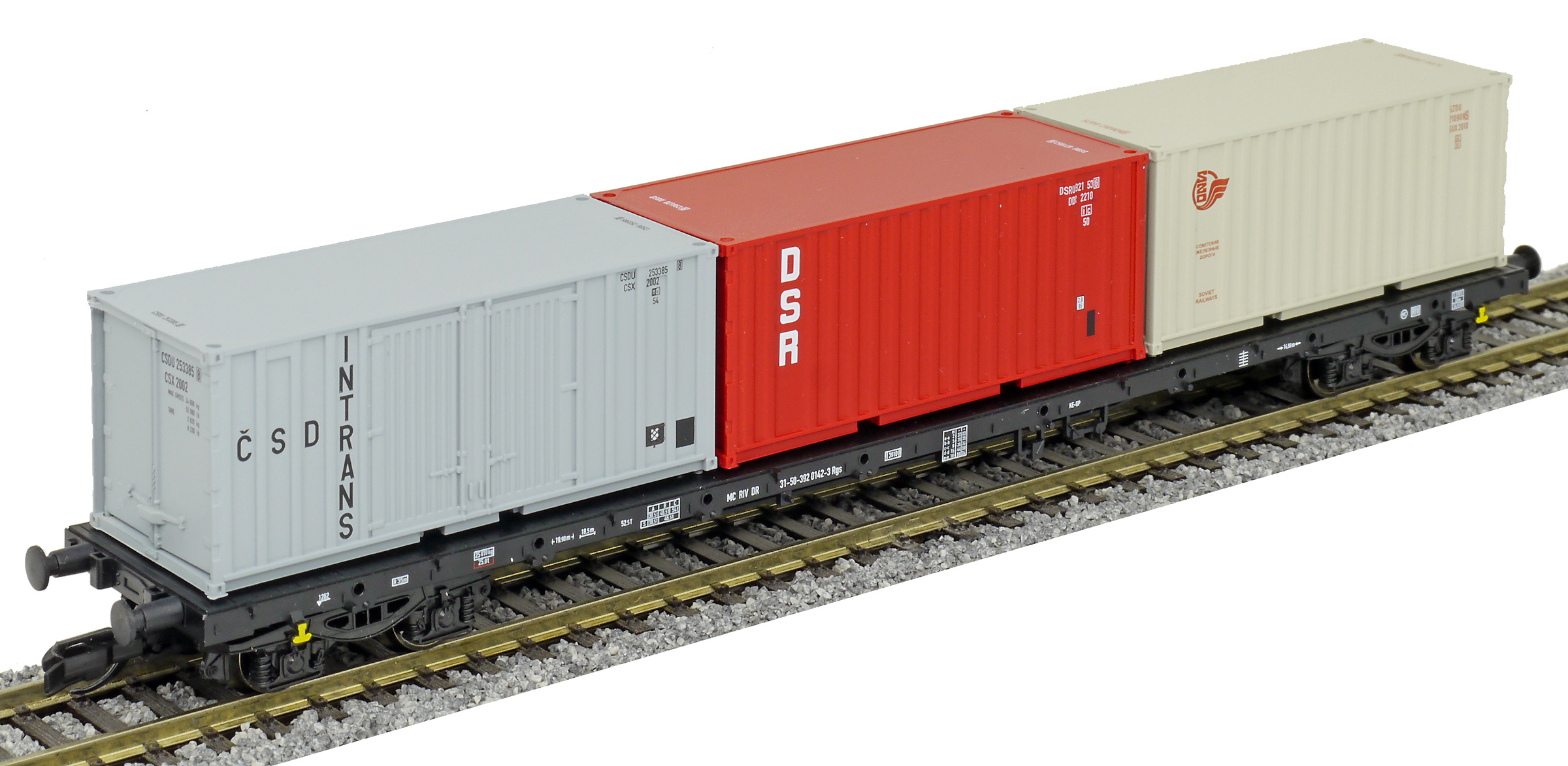 | nákladní plošinový vůz černý se třemi kontejnery 20' |