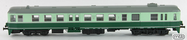 | motorový vůz zelený-tyrkysový s šedou střechou, výstražný pruh na čelech |