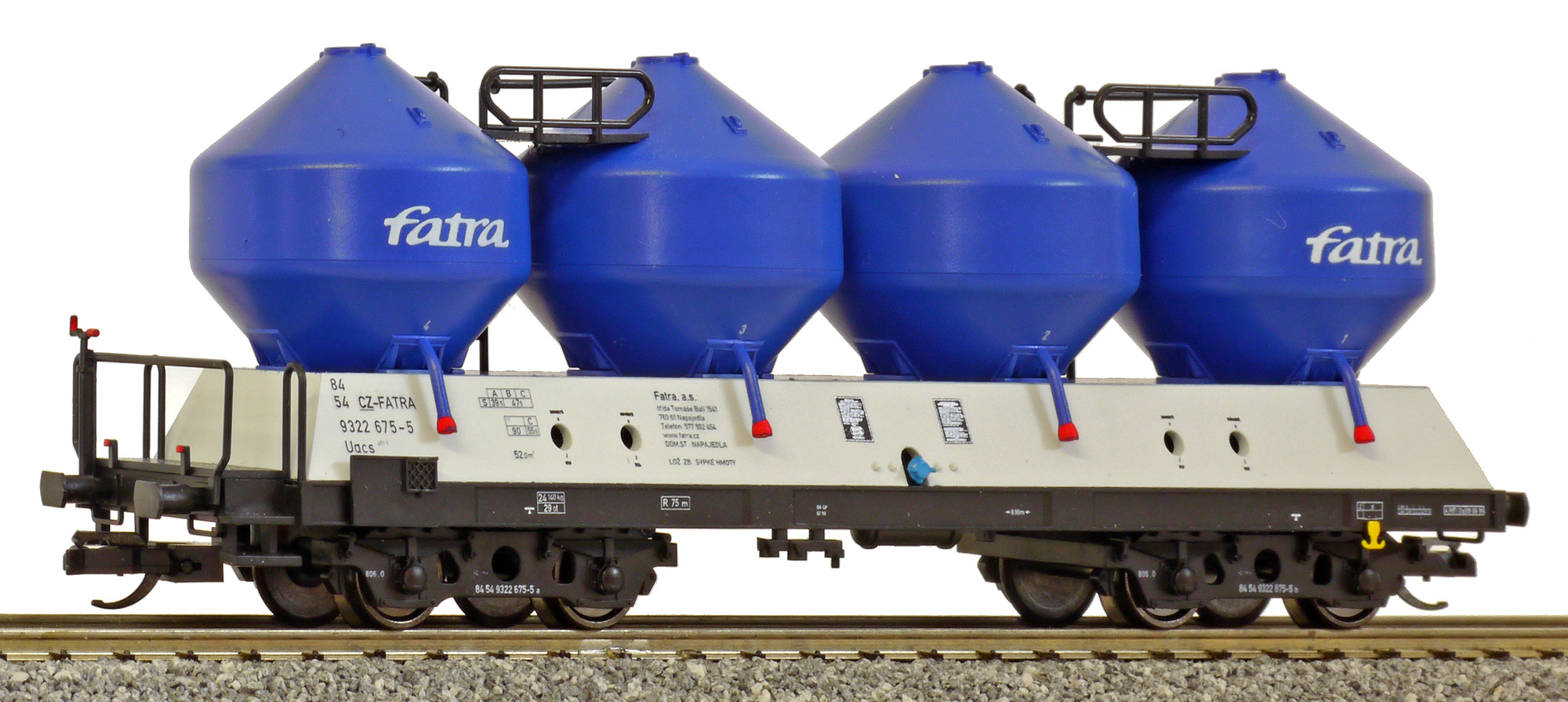 | nákladní samovýsypný vůz šedý-modrý s modrými nádobami a s logem „Fatra“ |