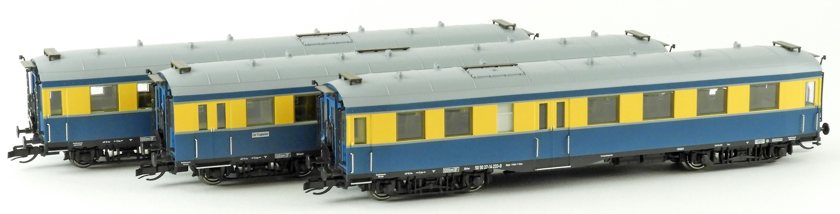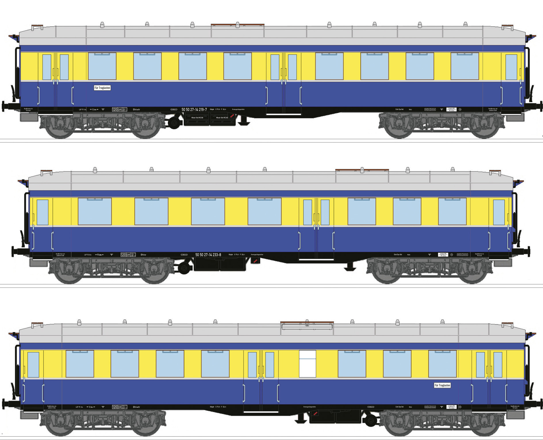 | set tří osobních vozů v barevném schematu „Leipziger S-Bahn“ |