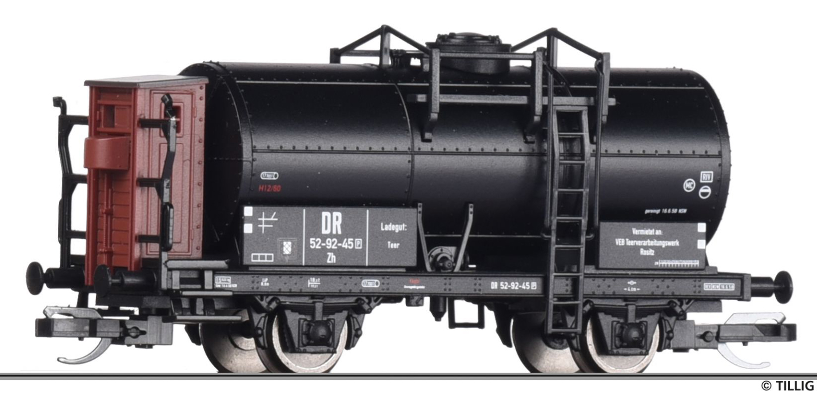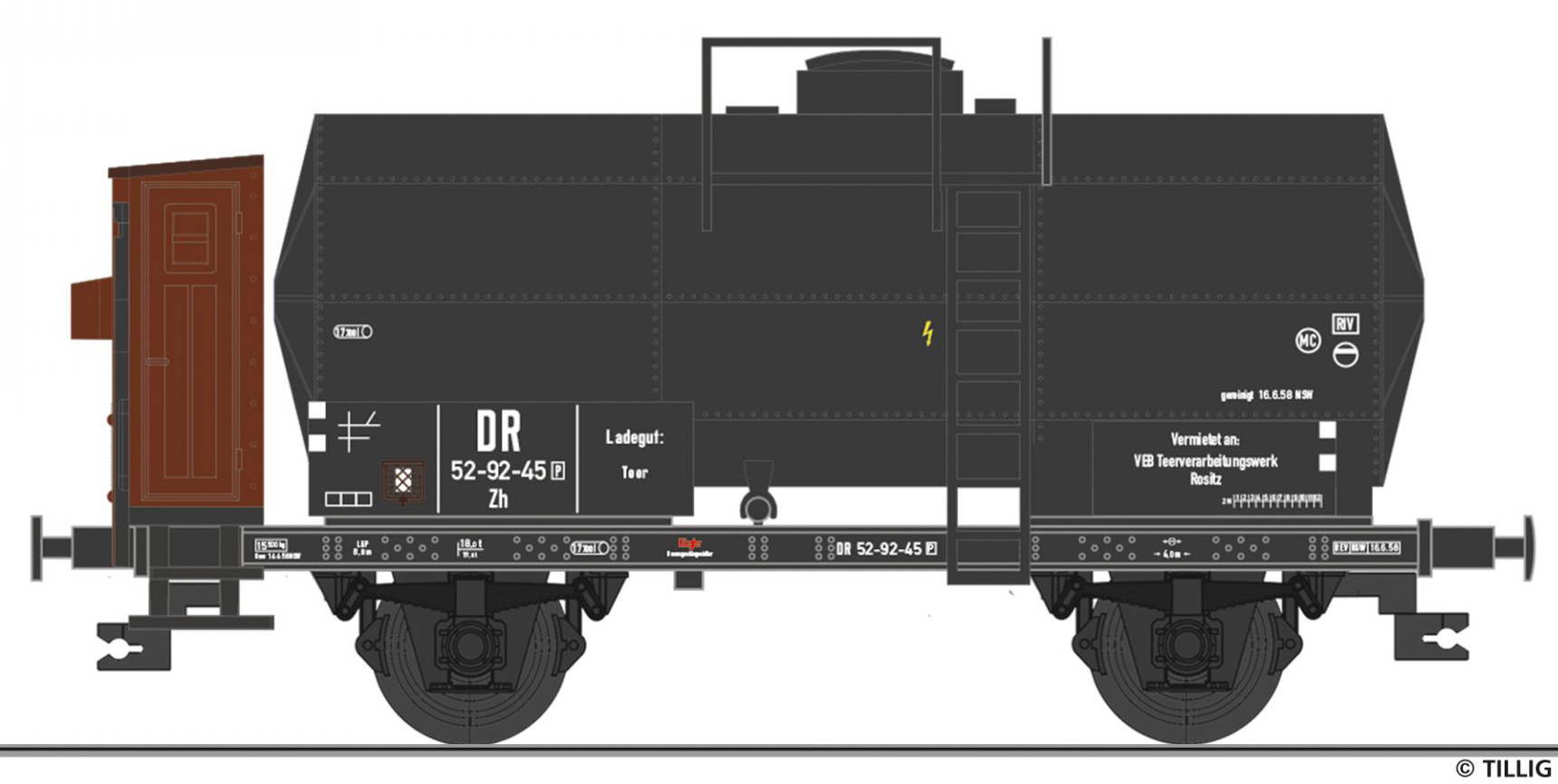 | kotlový vůz tmavý s brzdařskou budkou „VEB Teerverarbeitungswerk Rositz“ |