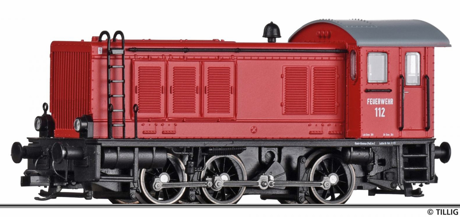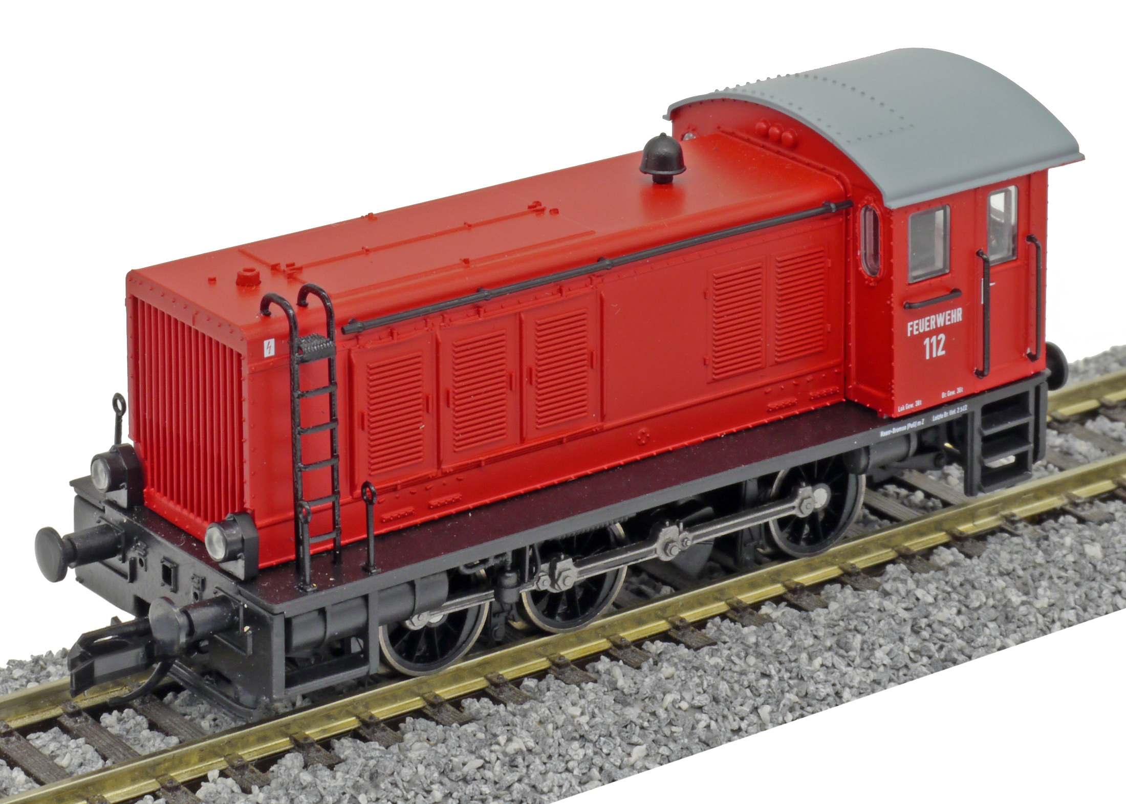 | dieselová lokomotiva červená s šedou střechou, černý rám a pojezd „Feuerlöschzu“ |