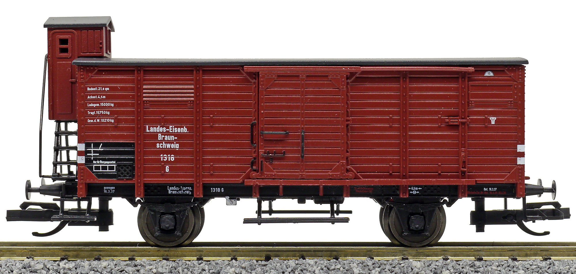 krytý nákladní vůz červenohnědý s černou střechou a s brzdařskou budkou