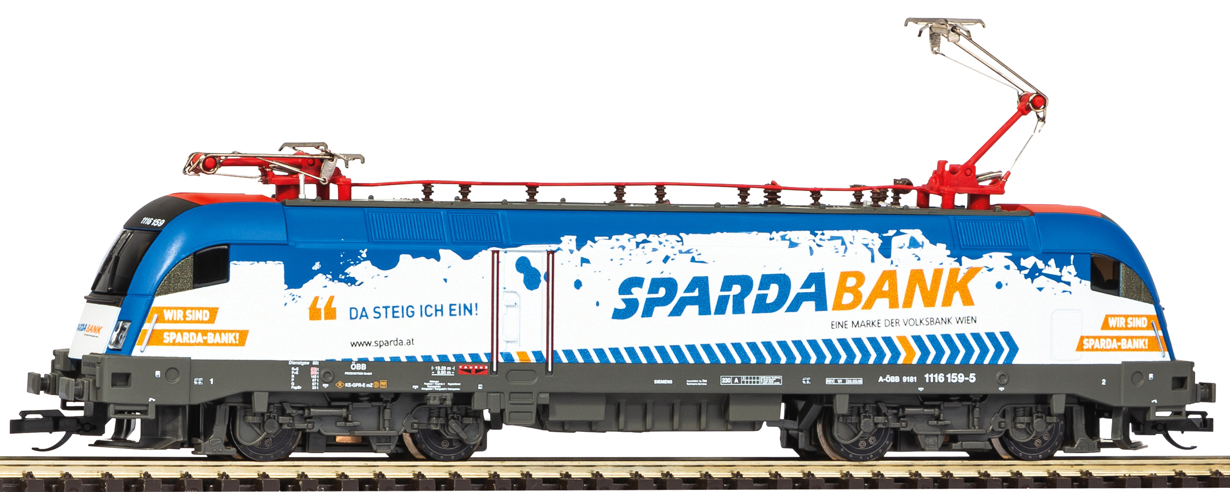 | elektrická lokomotiva modrá-bílá s reklamním potiskem „SPARDA-BANK“ |