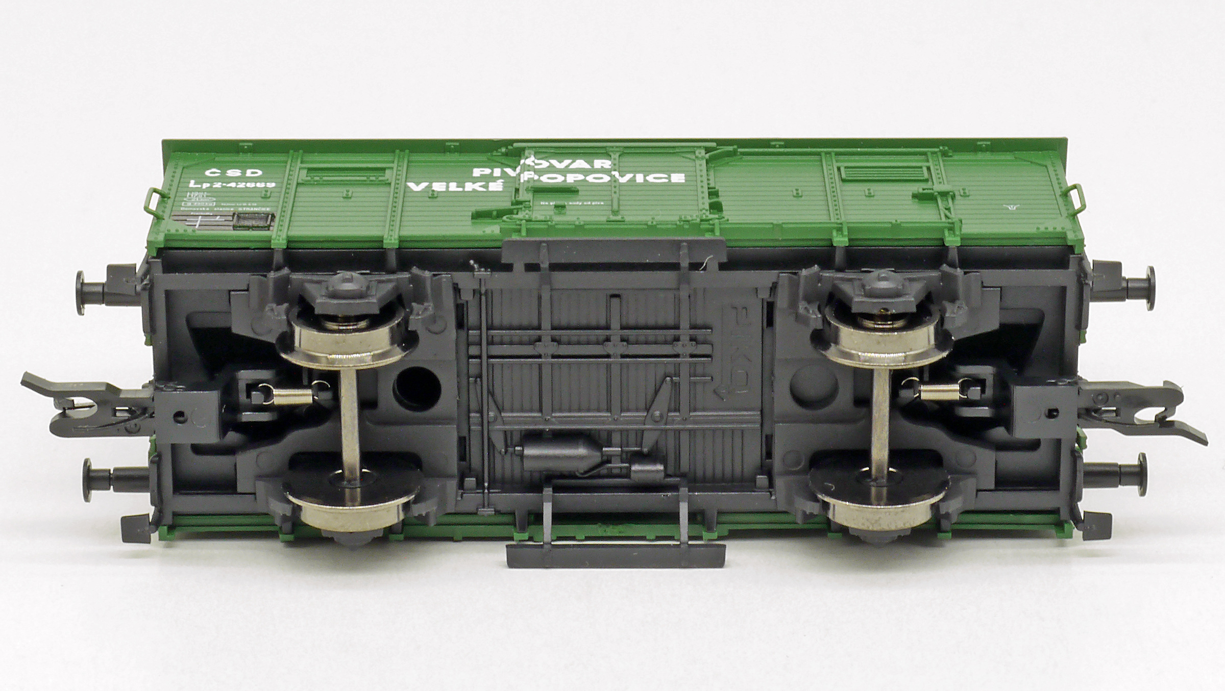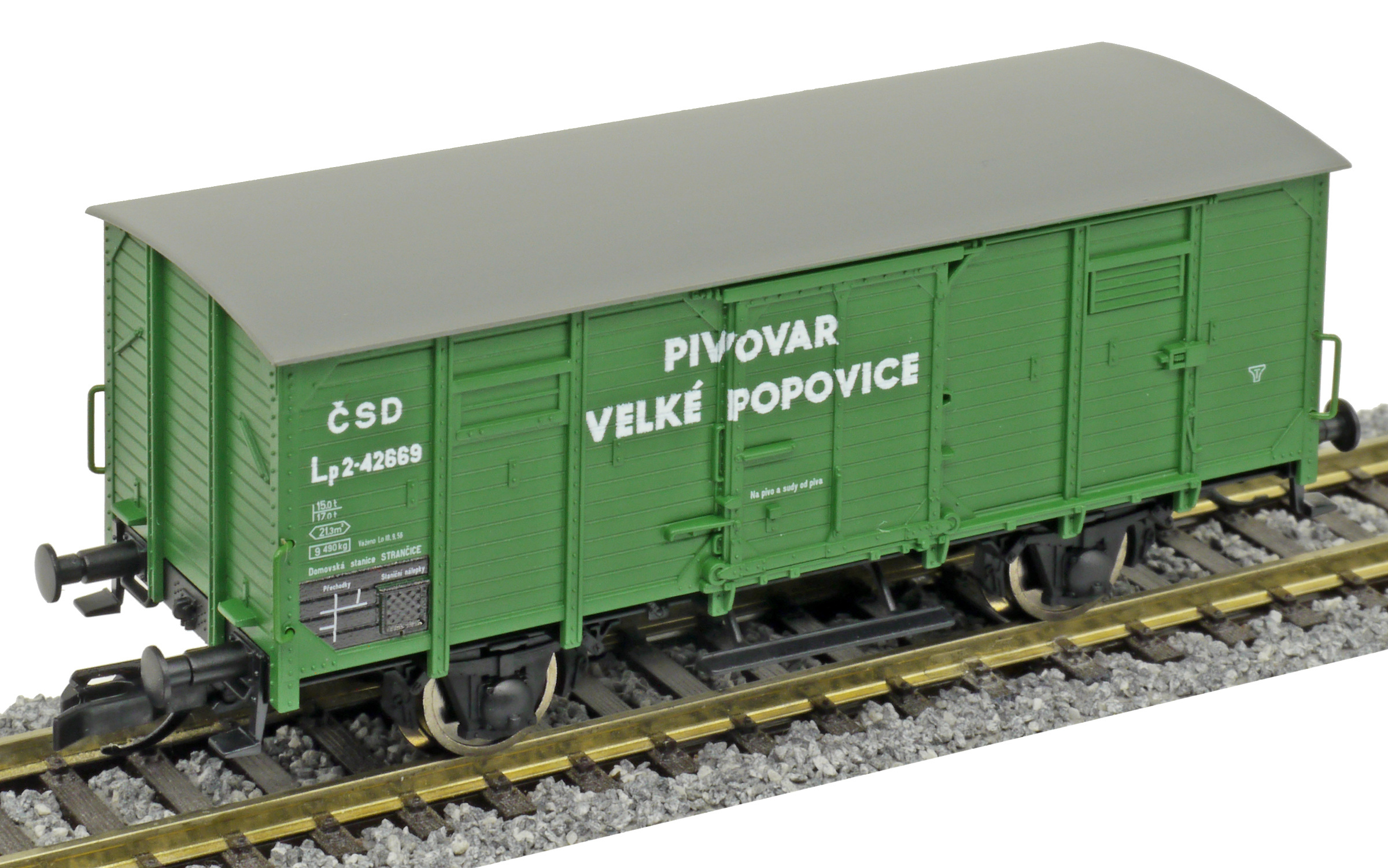 Popis   krytý nákladní vůz zelený s šedou střechou „PIVOVAR VELKÉ POPOVICE“