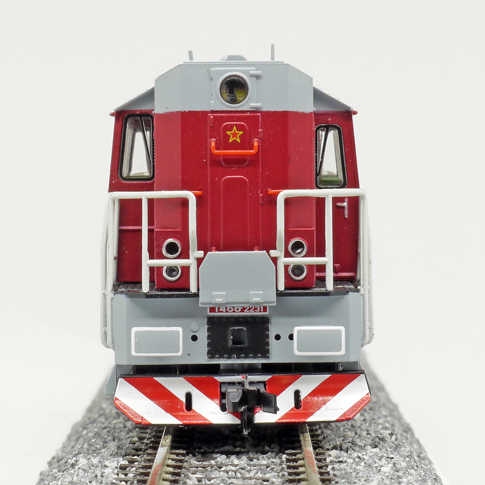 Popis   dieselová lokomotiva červená-šedá, bílé zábradlí