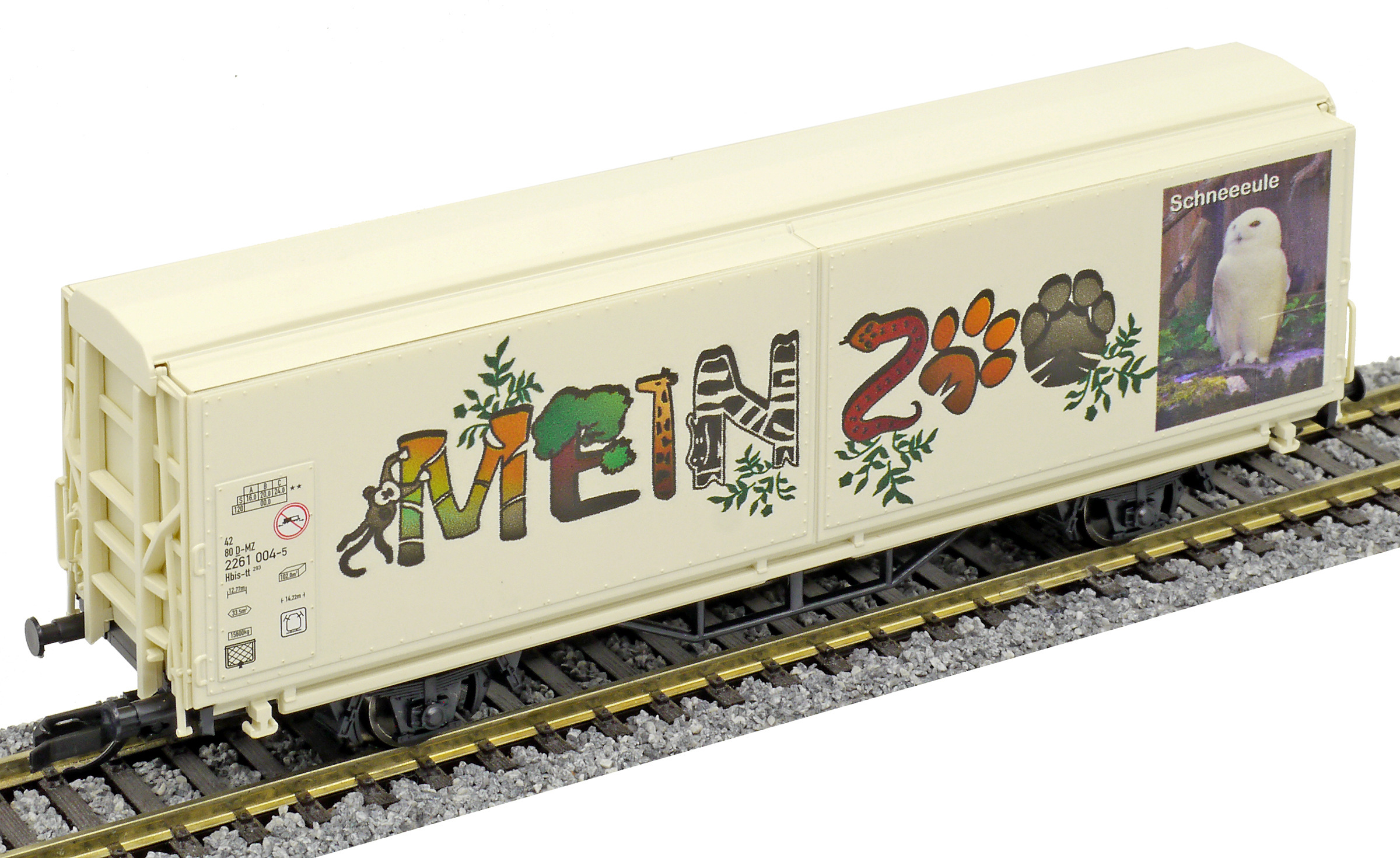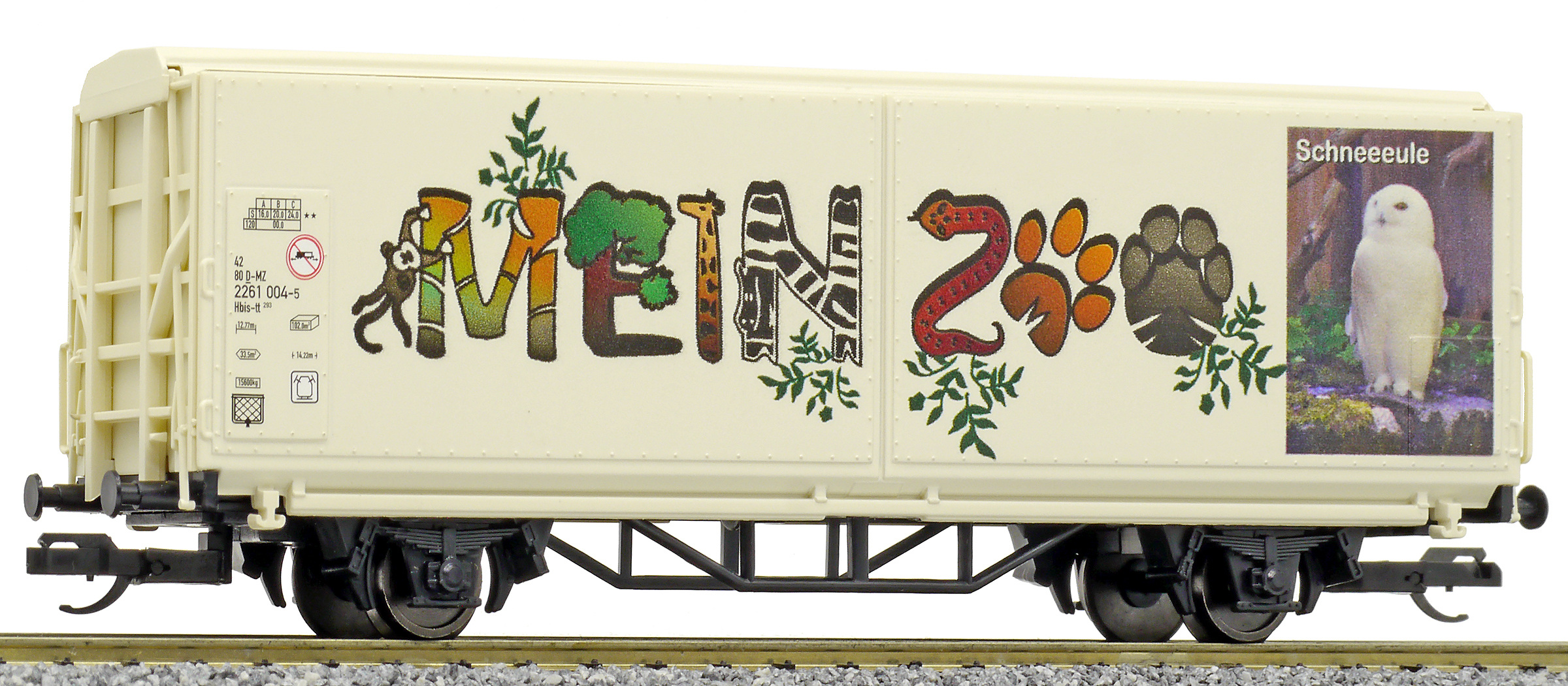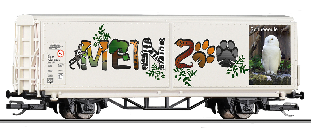 | krytý nákladní vůz s posuvnými stěnami a s reklamním potiskem „Mein Zoo” |