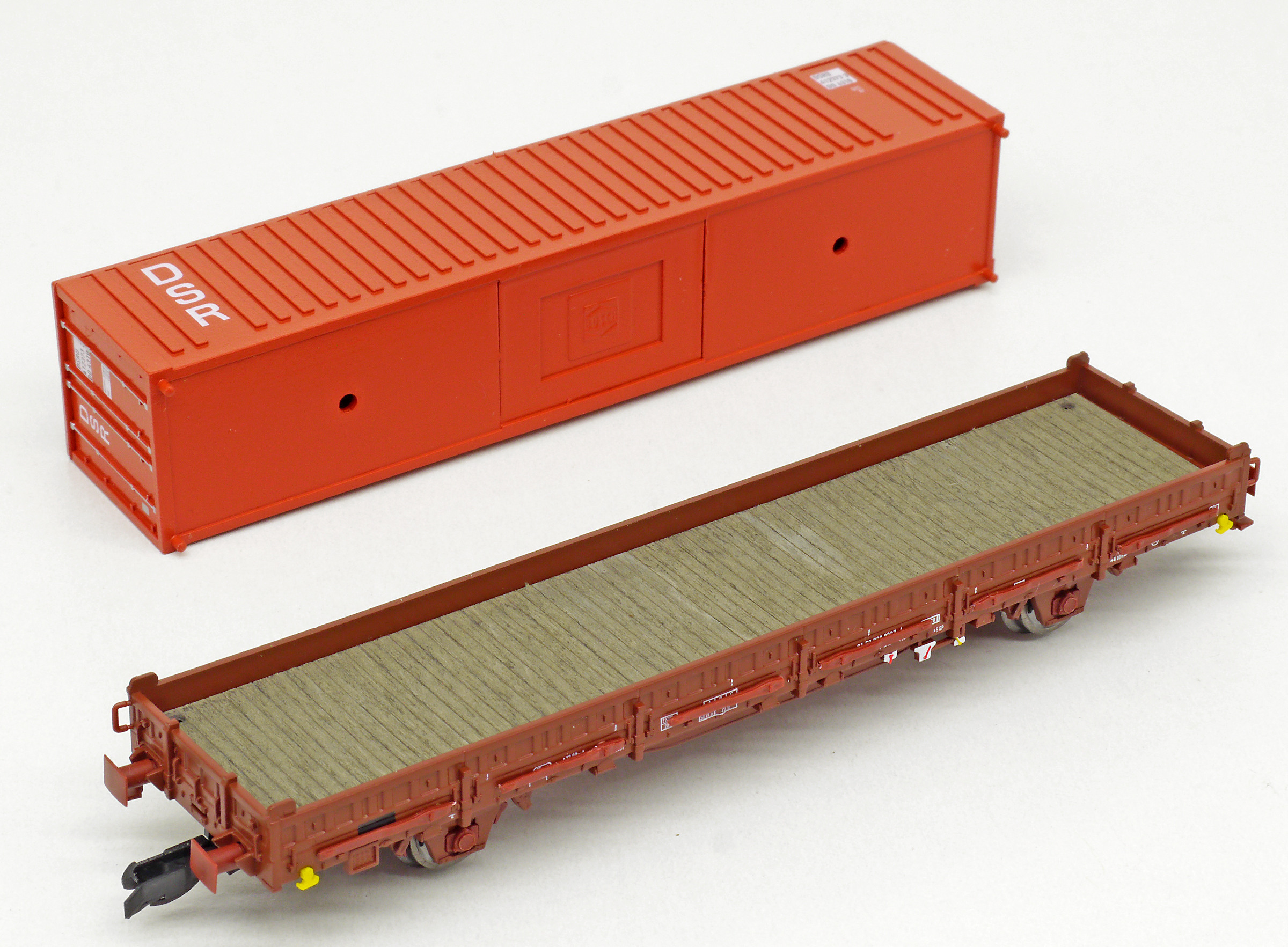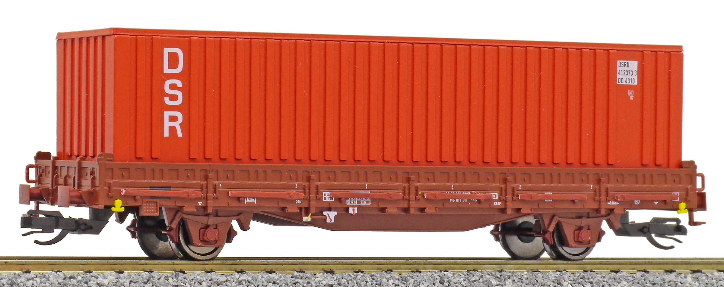 | nízkostěnný nákladní vůz červenohnědý s klanicemi s nákladem kontejneru 40' „DSR“ |