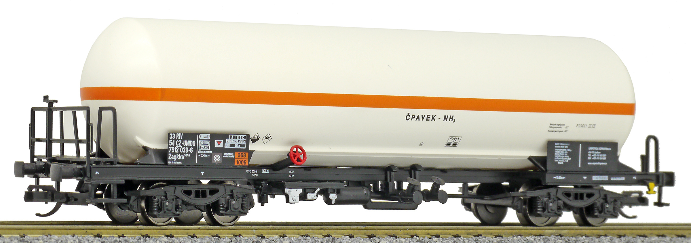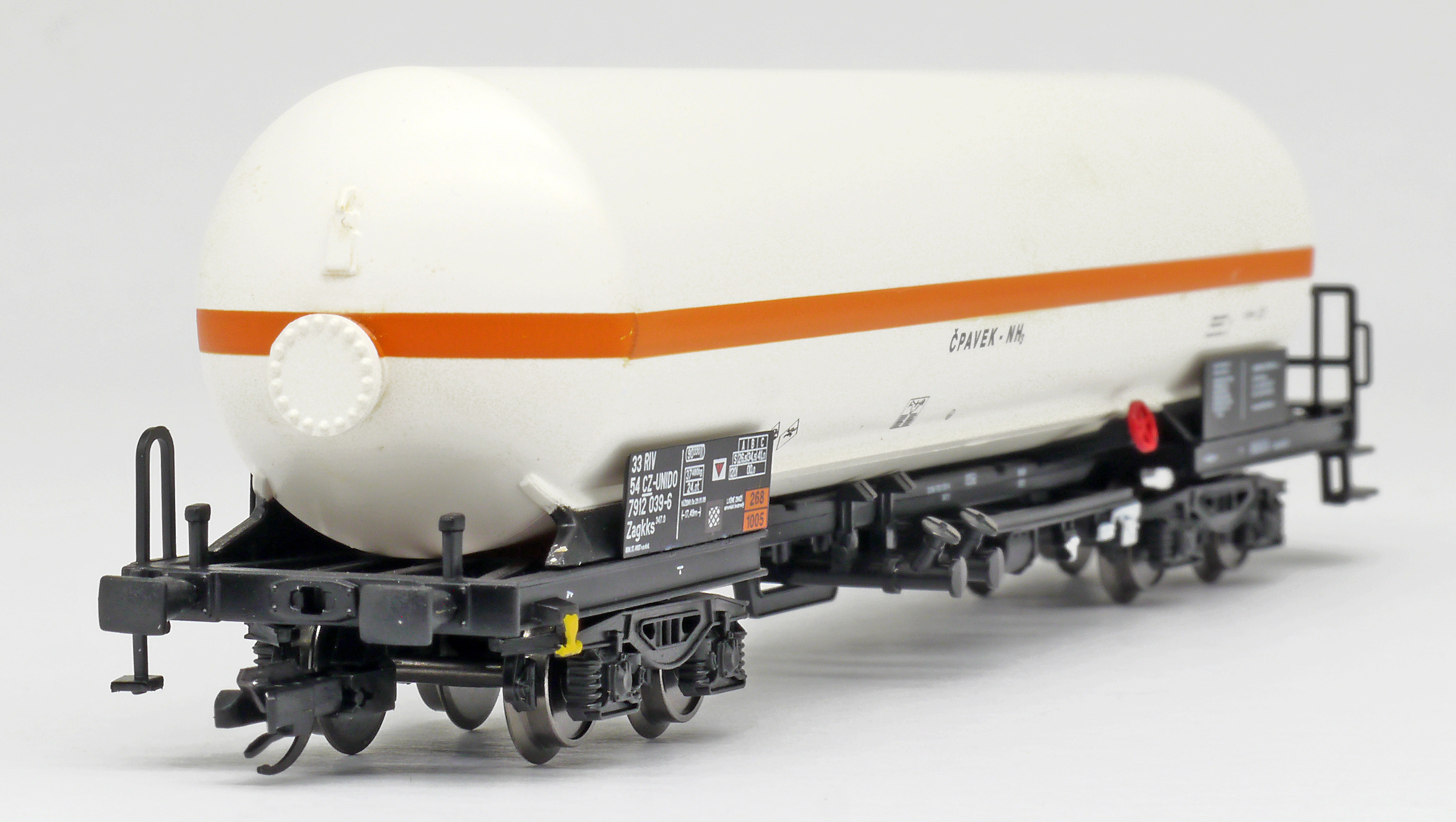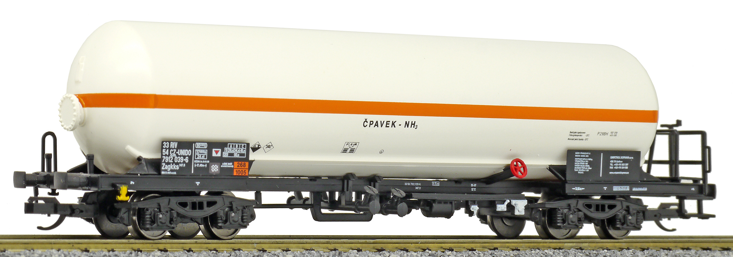 | kotlový vůz světle krémový s oranžovým proužkem na přepravu čpavku |