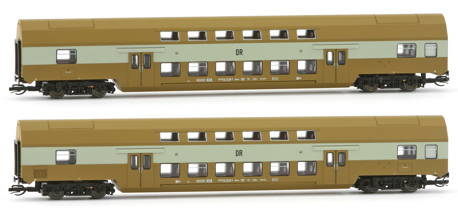 | set dvou středových patrových vozů v barvě hořčice |