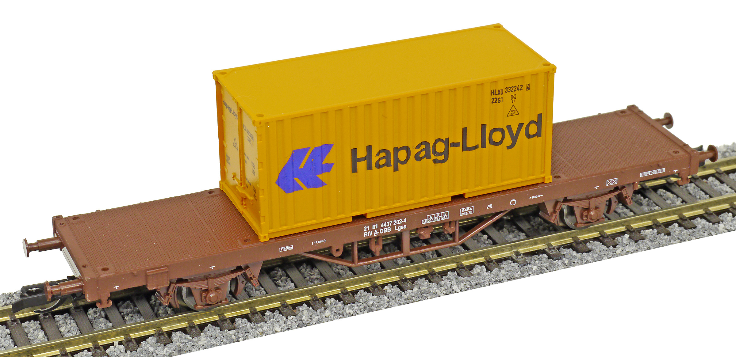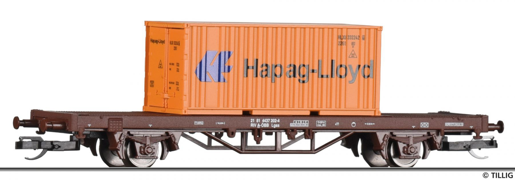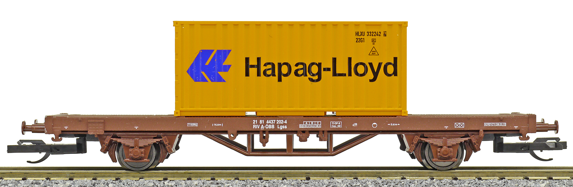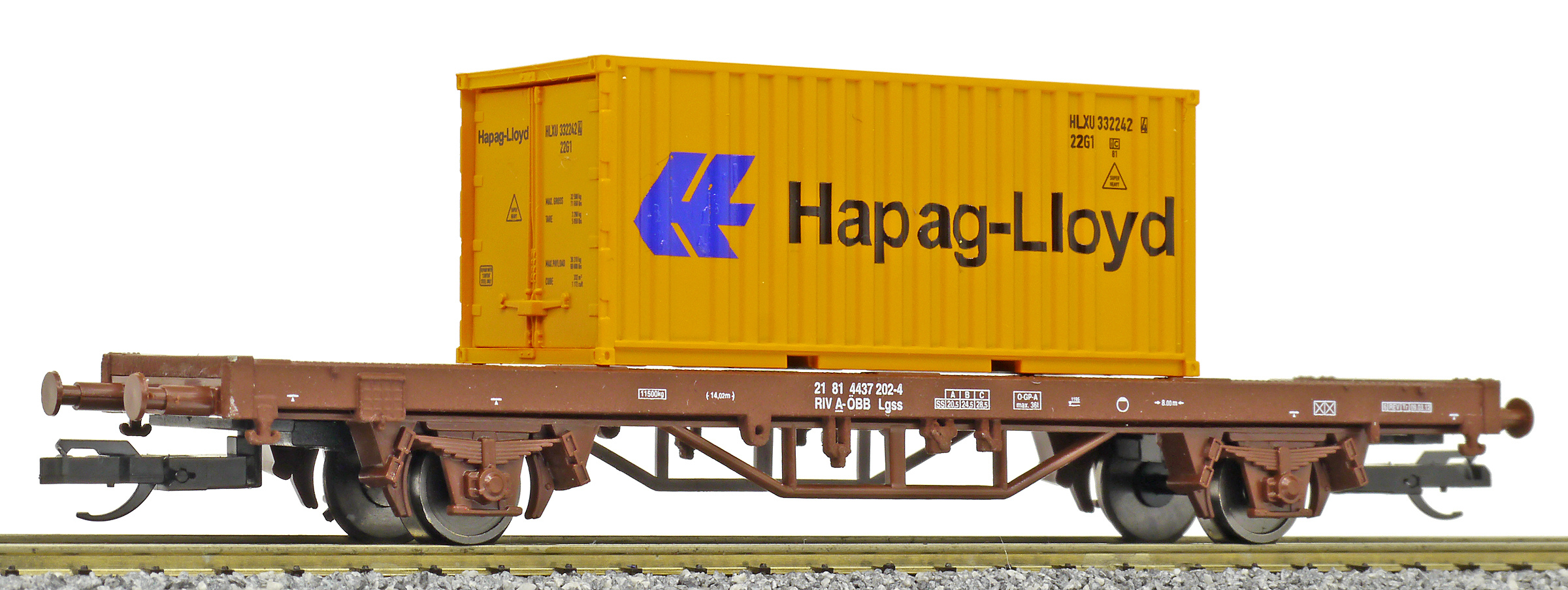 | plošinový nákladní vůz červenohnědý s kontejnerem 20' „Hapag-Lloyd“ |