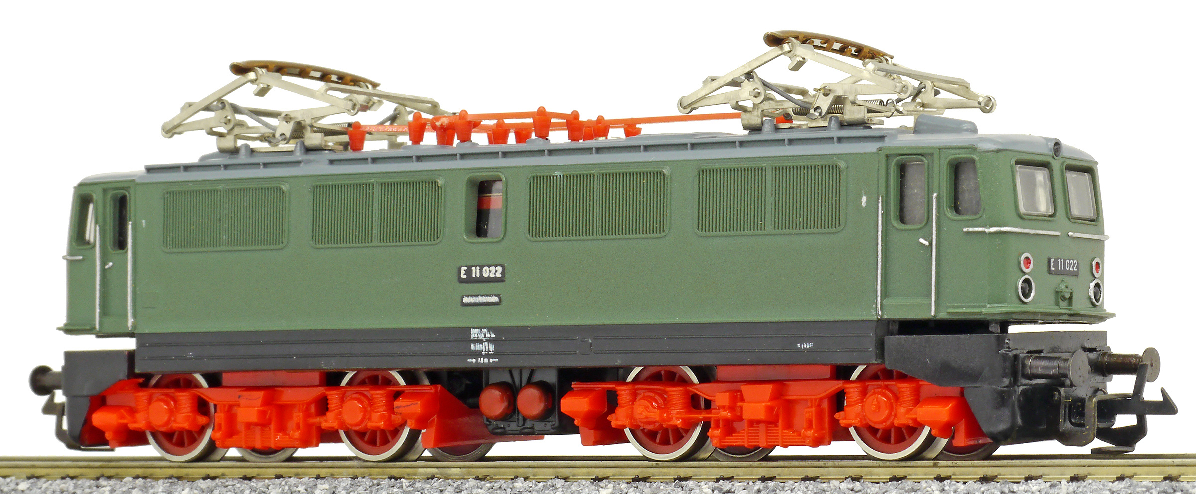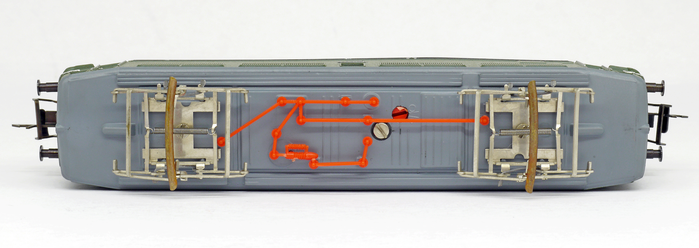 | elektrická lokomotiva zelená s černým rámem, šedou střechou a červenými podvozky |