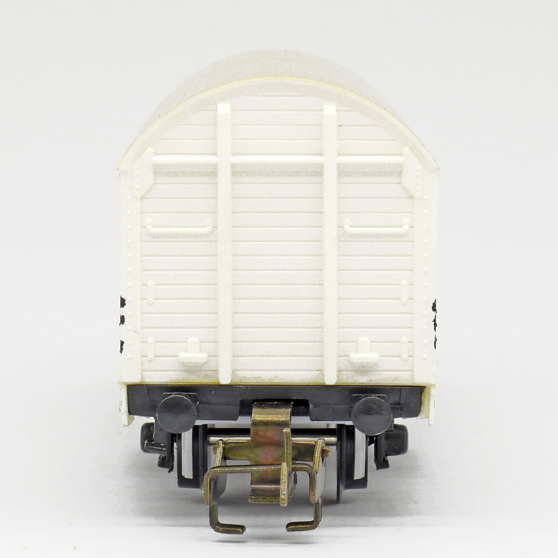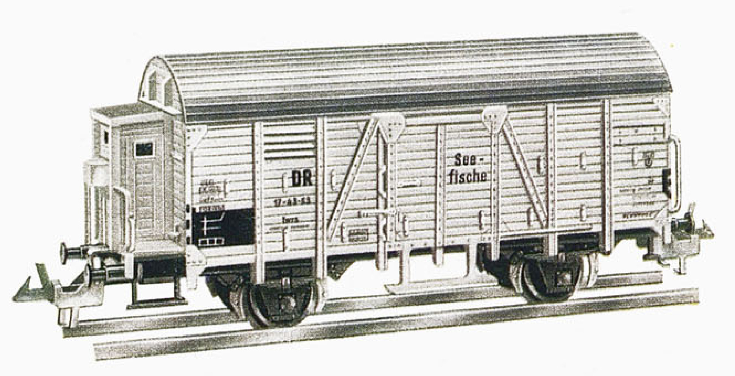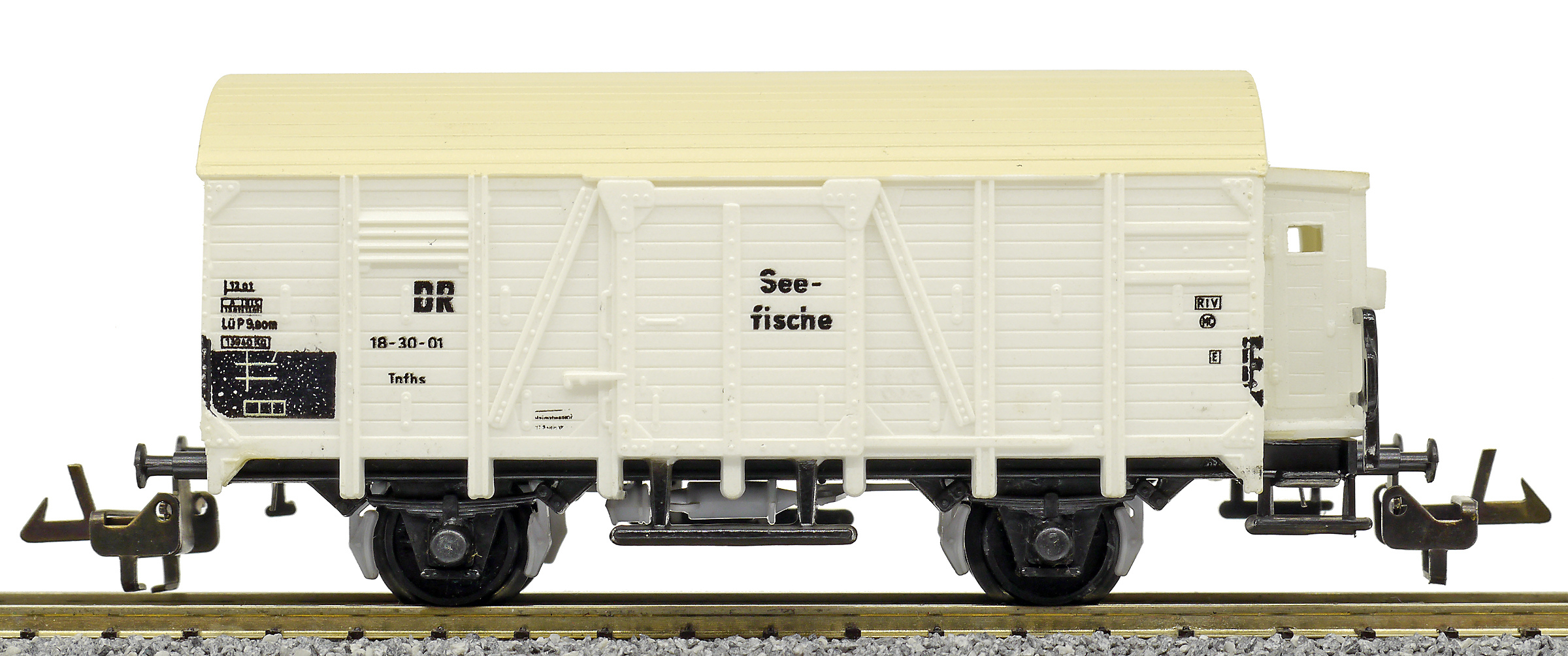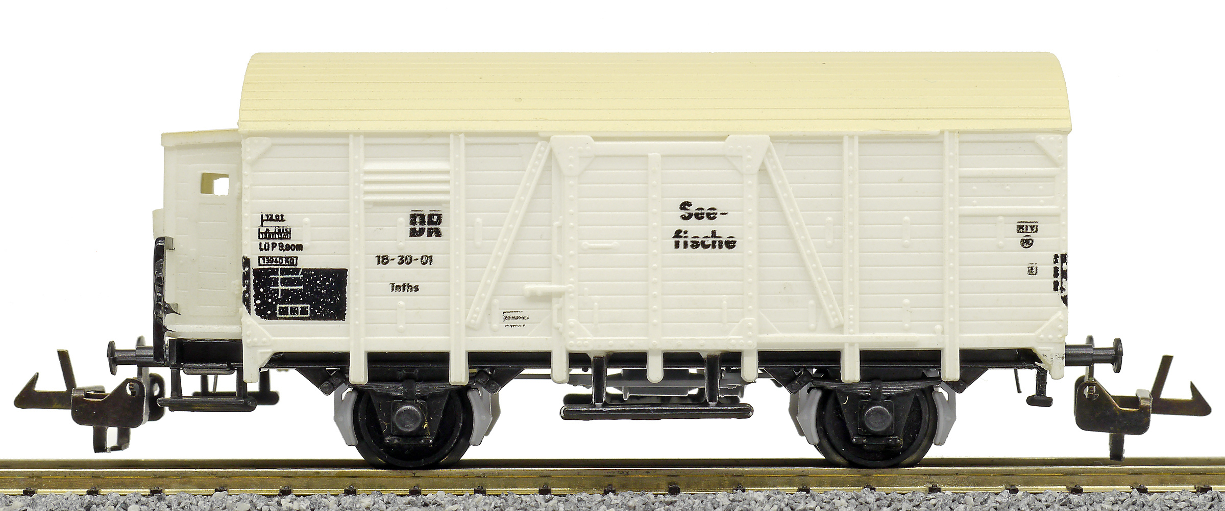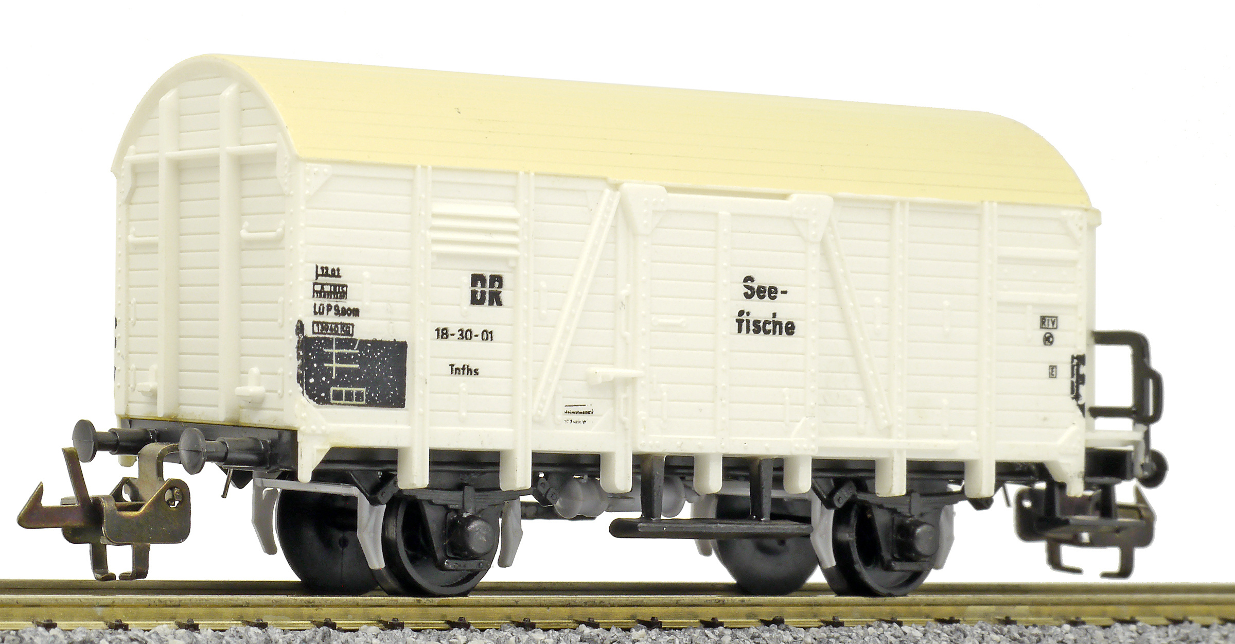 nákladní chladící vůz bílý s krémovou střechou a s brzdařskou budkou na přepravu ryb „Seefische“
