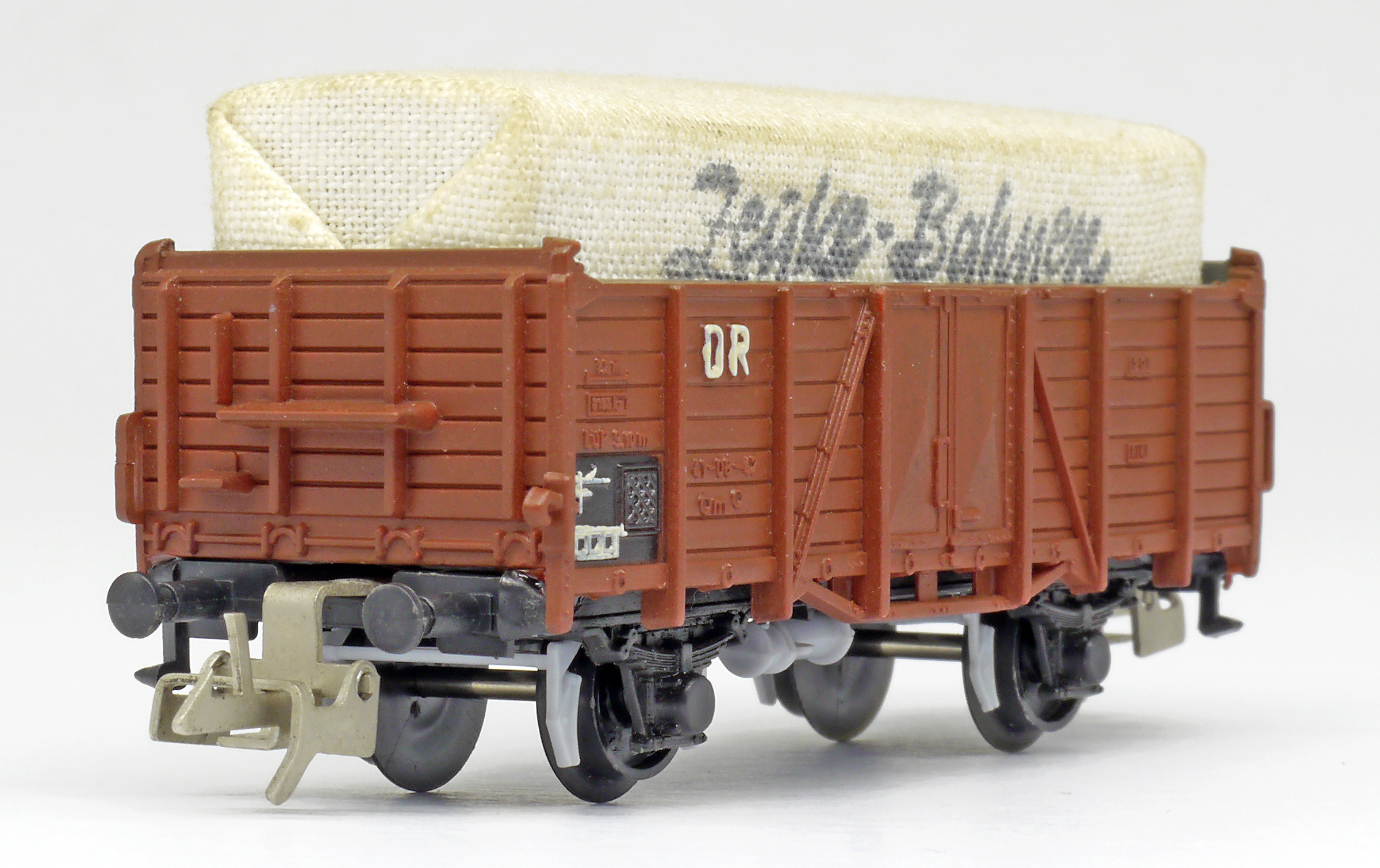 otevřený nákladní vůz červenohnědý s nákladem krytým plachtou „Zeuke-Bahnen“