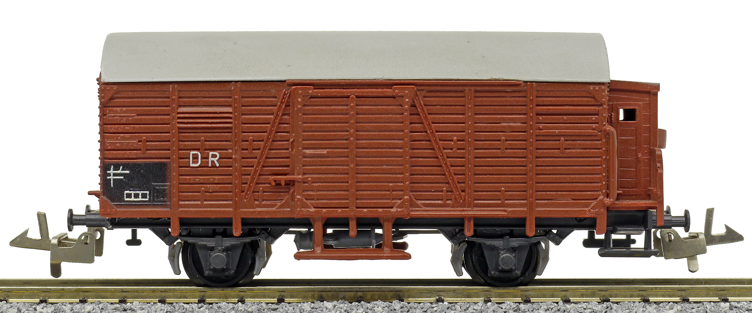 | krytý nákladní vůz červenohnědý s šedou střechou a s brzdařskou budkou |