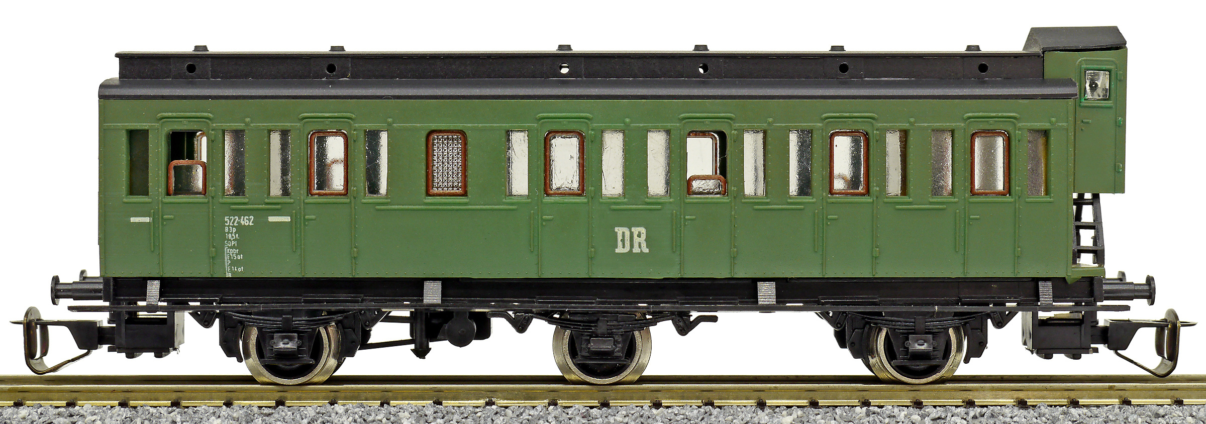 Popis   oddílový osobní vůz zelený s černou střechou a s brzdařskou budkou