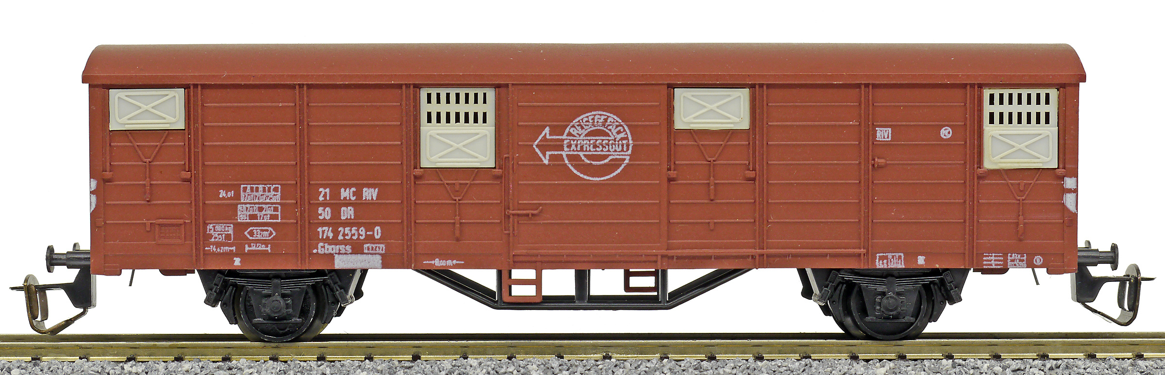 | • 21 50 174 2559-0 | → | nákladní, nezávislé nápravy, pevný rozchod, ve vlastnictví železniční správy, RIV, PPV |