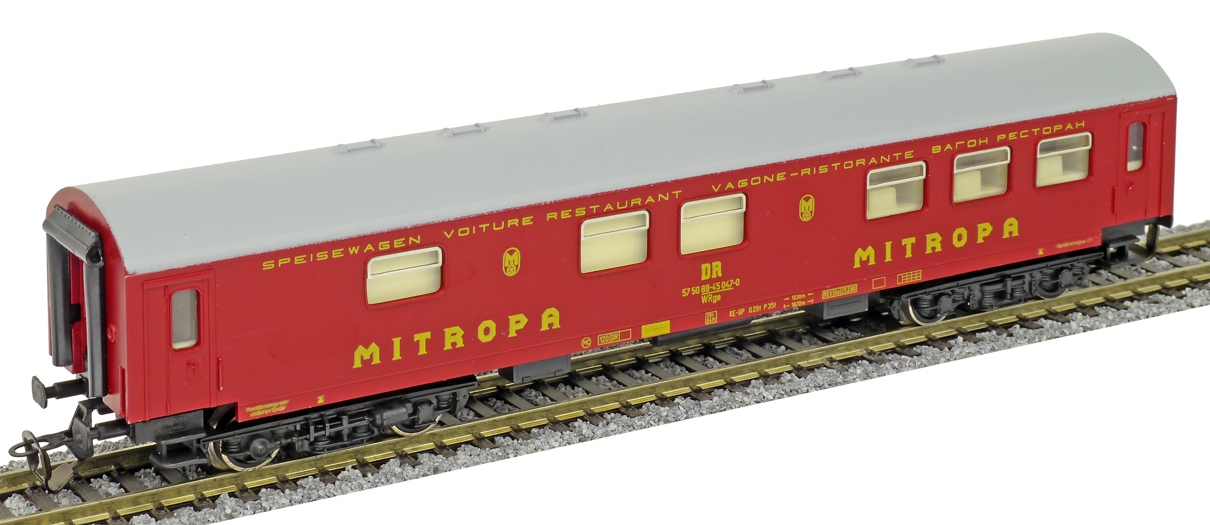 | jídelní vůz červený s šedou střechou „MITROPA“ |