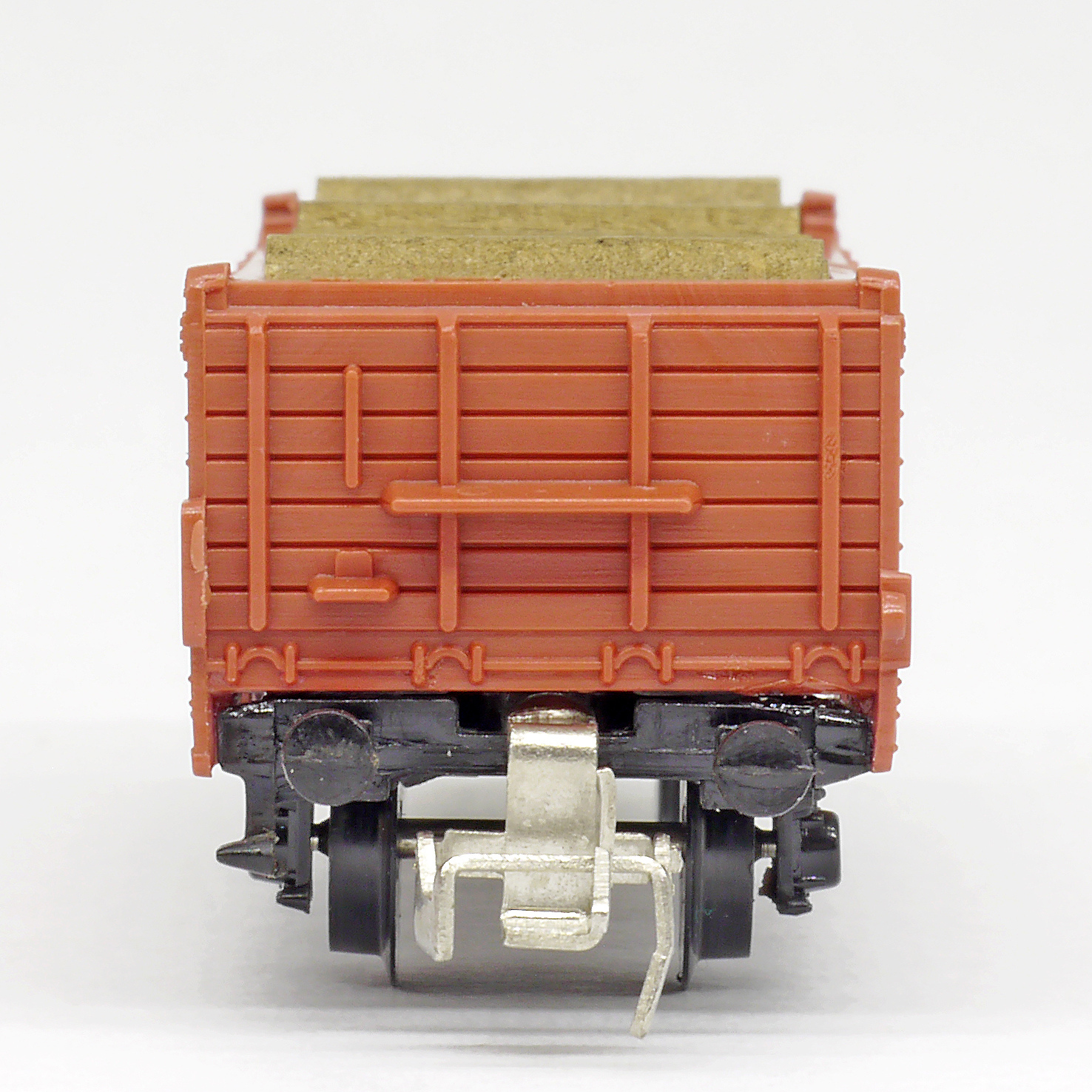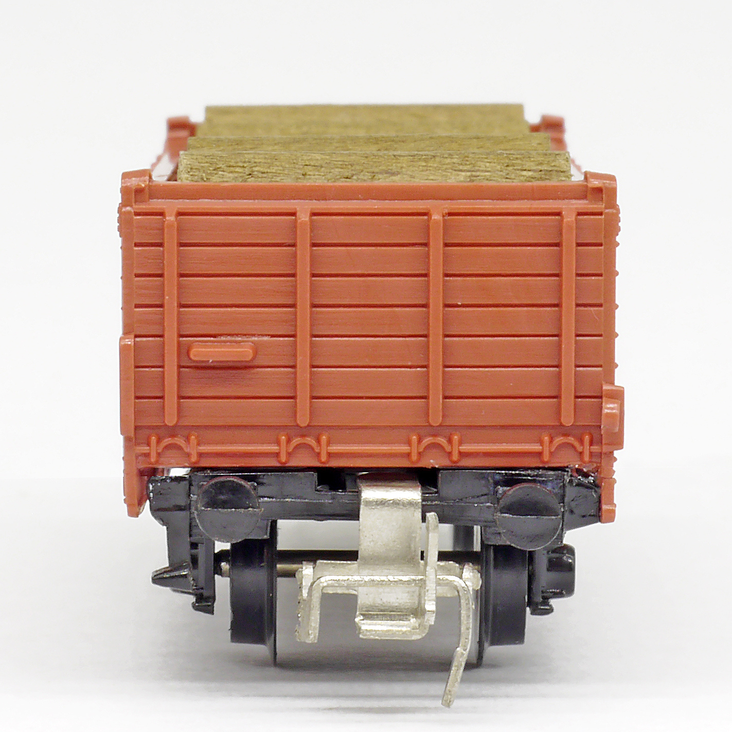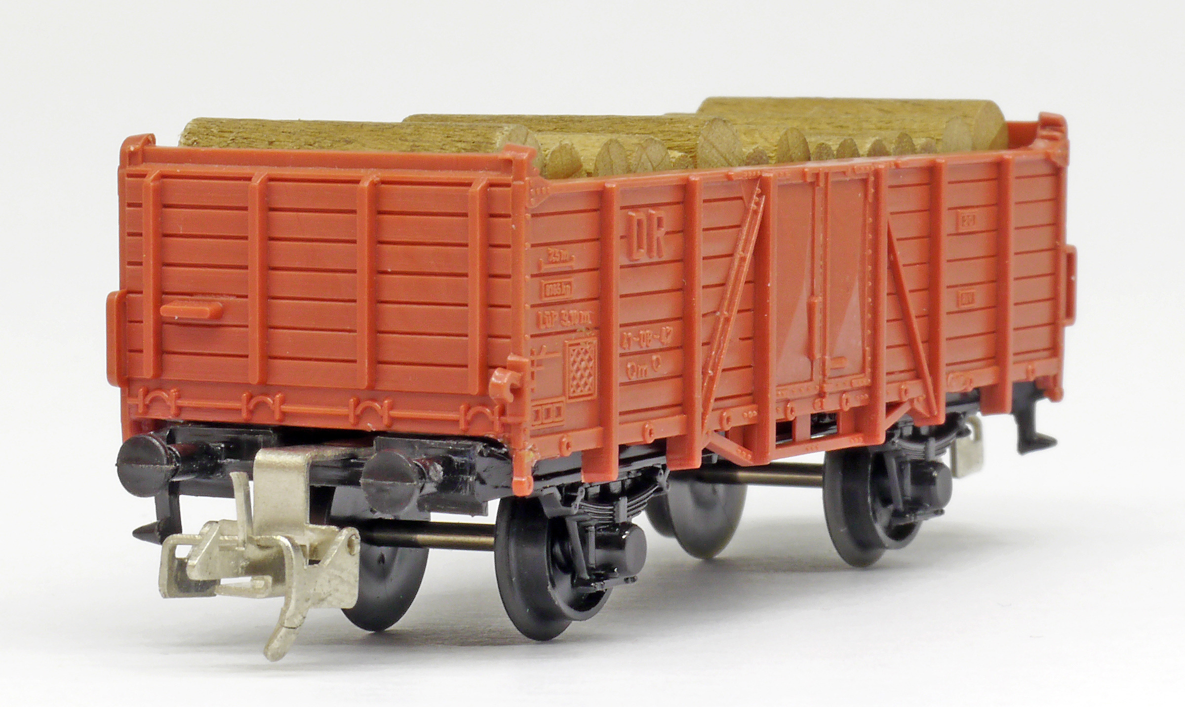 | otevřený nákladní vůz červenohnědý nebo zelený s nákladem kulatiny |