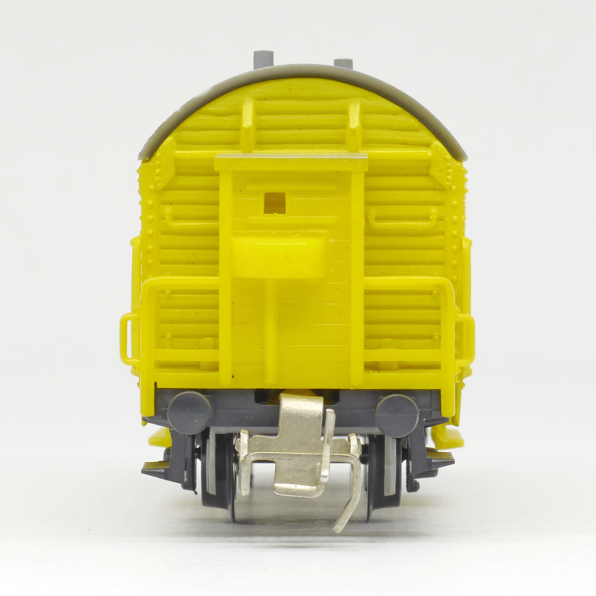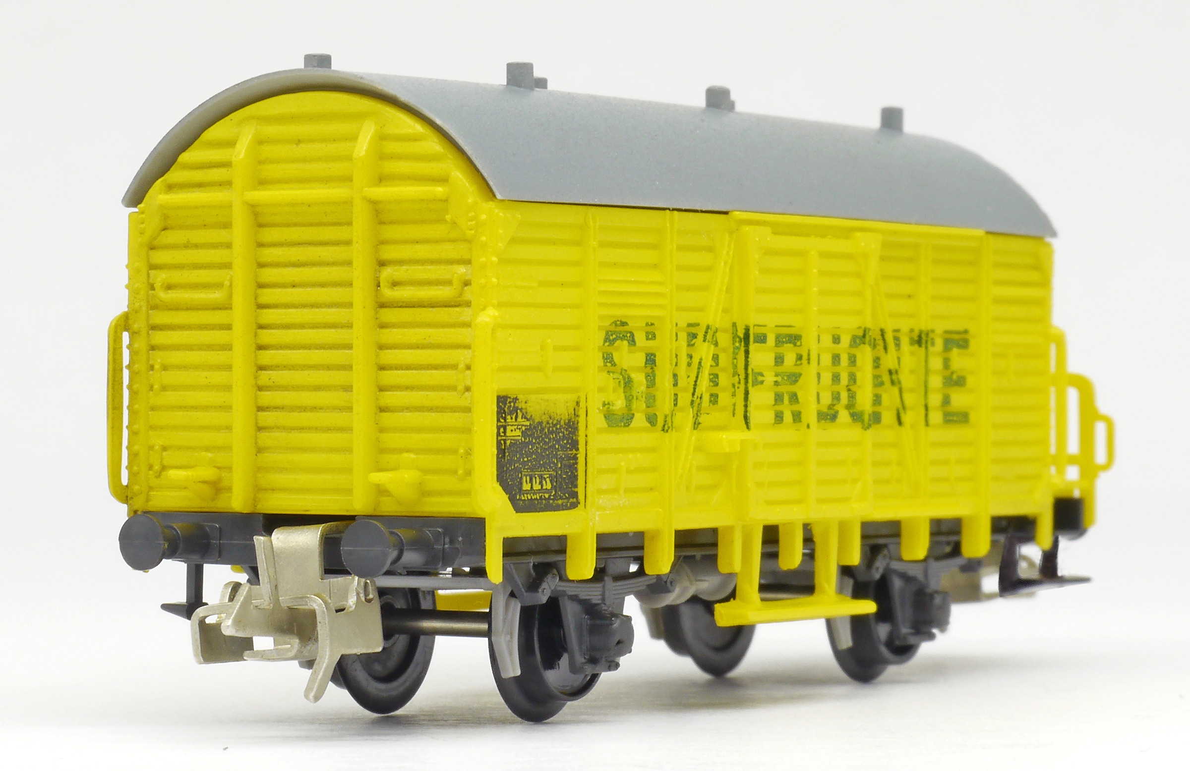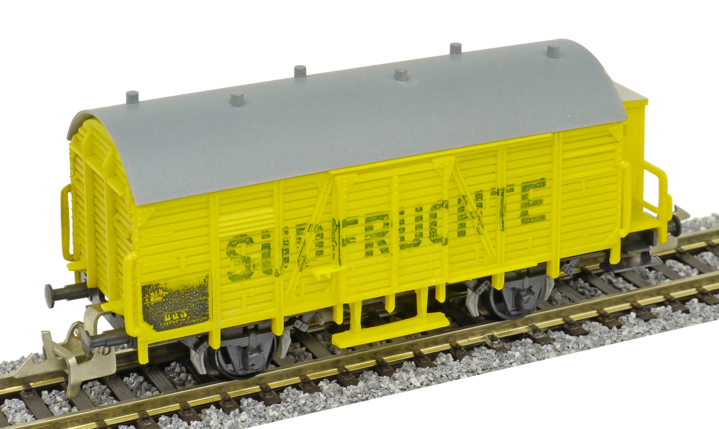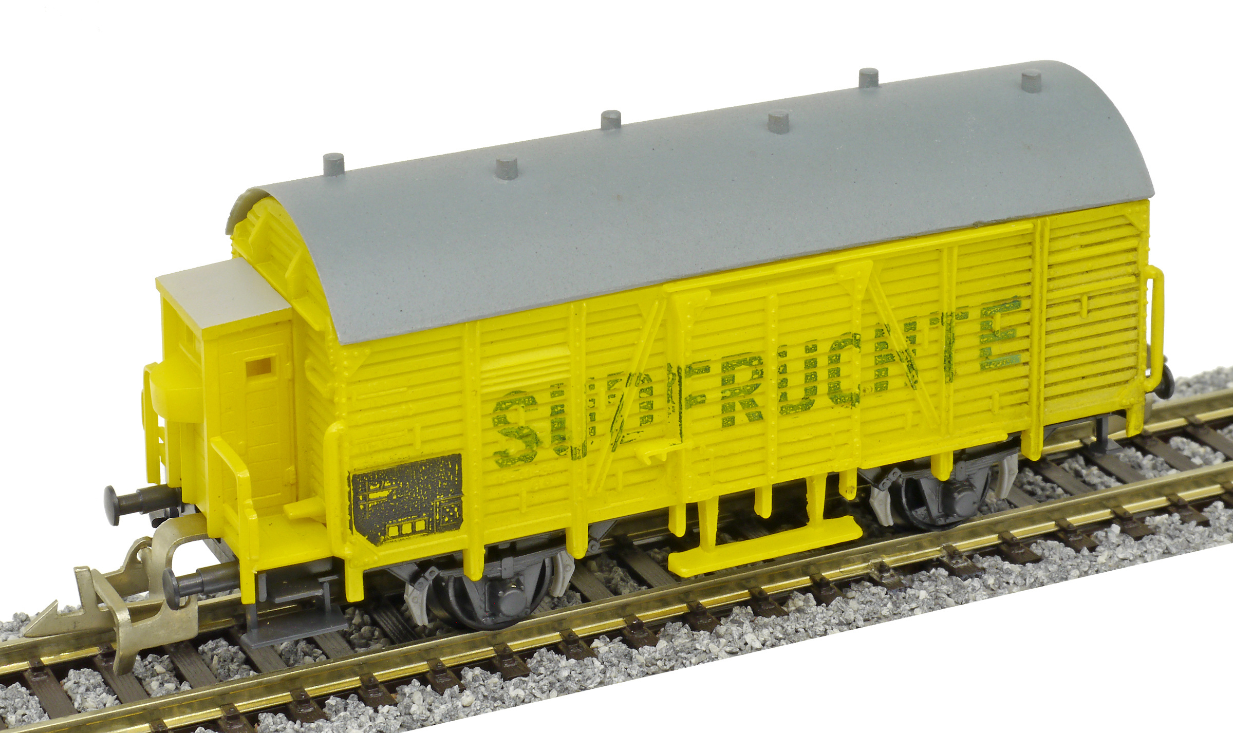 | nákladní chladící vůz žlutý s šedou střechou a s brzdařskou „Südfrüchte“ |