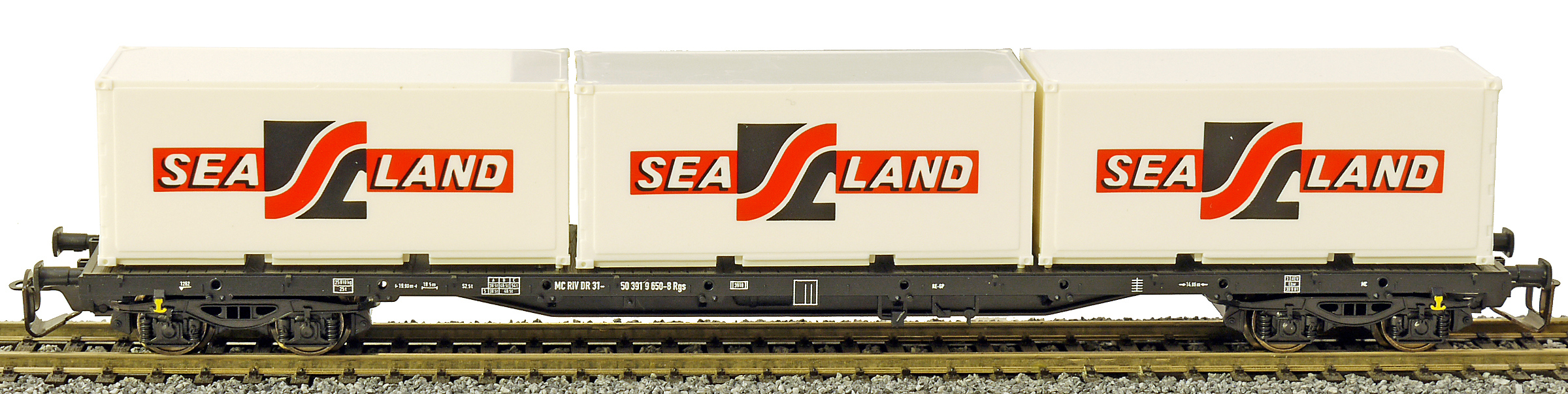 | nákladní plošinový vůz černý se třemi kontejnery 20' „SEA LAND“ |