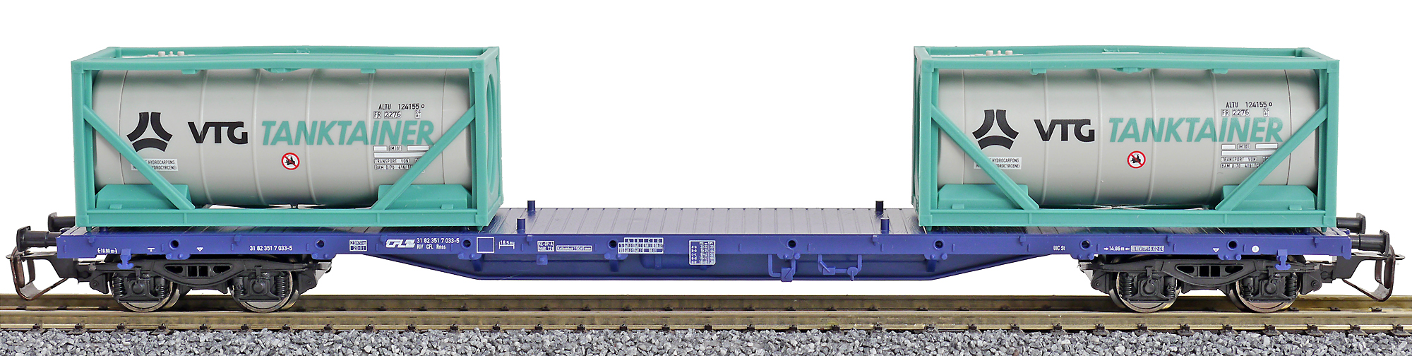 | nákladní plošinový vůz tmavěmodrý se dvěma cisternovými kontejnery „VTG“ |