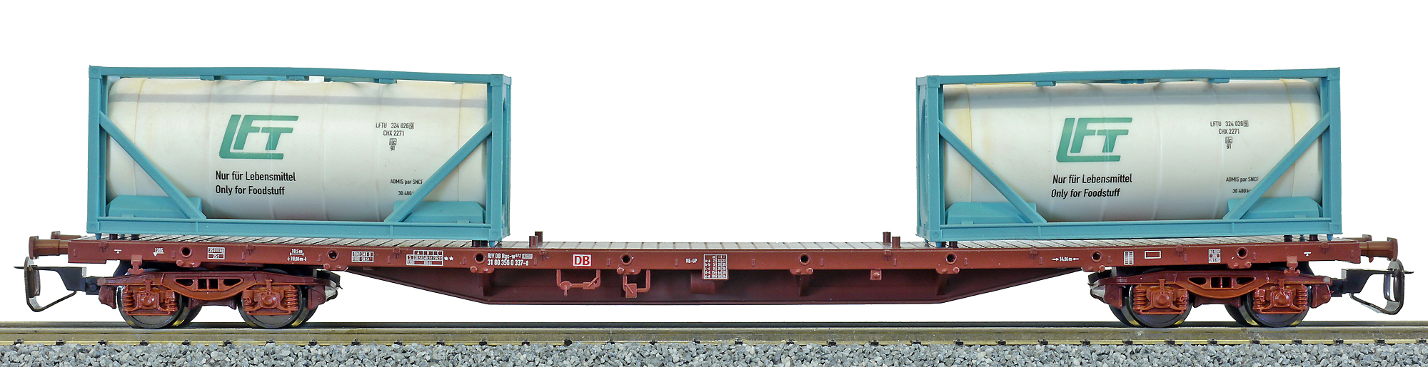 | nákladní plošinový vůz červenohnědý se dvěma cisternovými kontejnery „LFT“ |