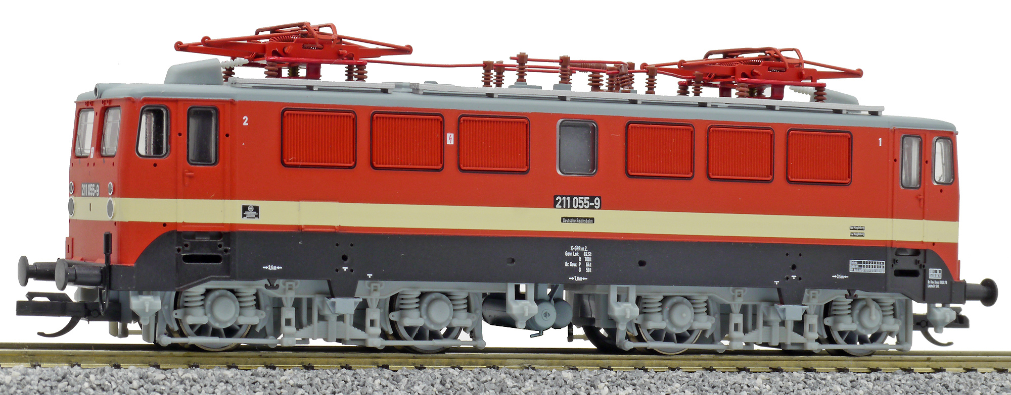 Popis   elektrická lokomotiva červená s krémovým pruhem, šedé podvozky