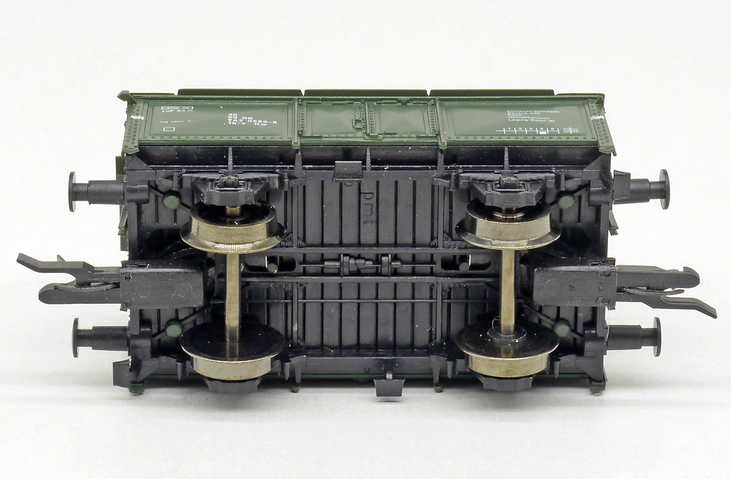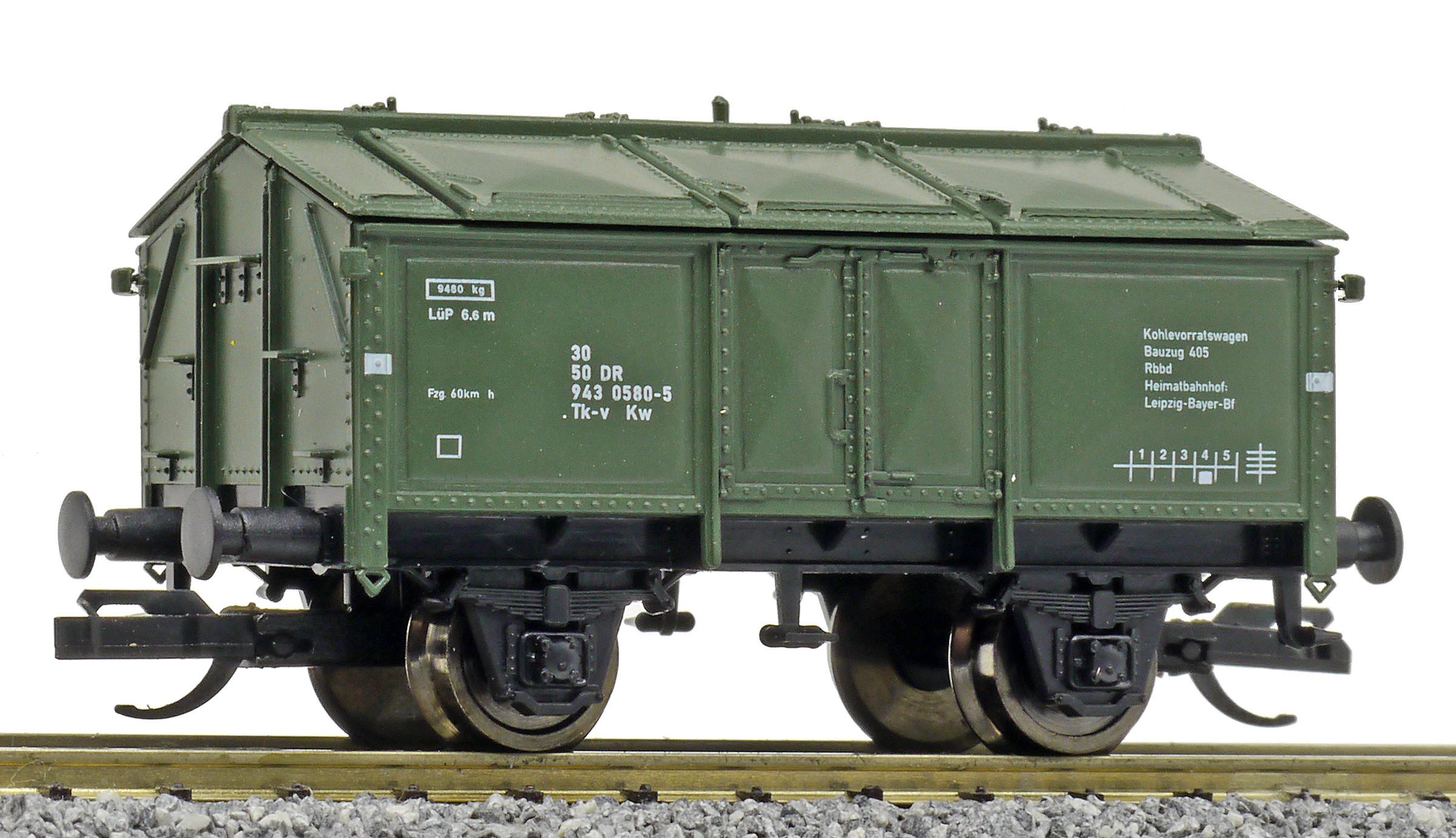 | nákladní vůz tmavě zelený s klapkami, černý pojezd, na uhlí do pracovního vlaku |