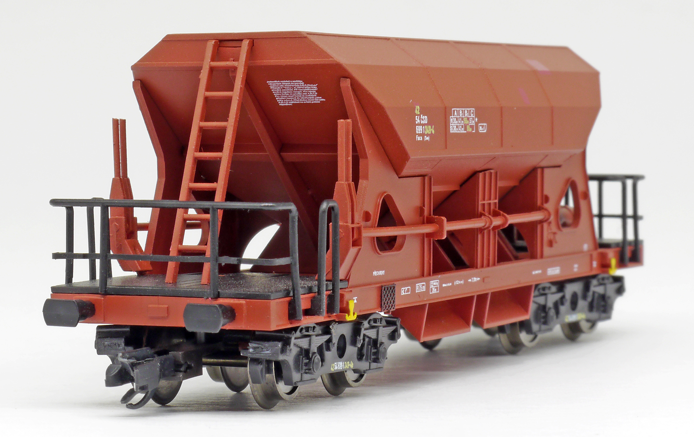 | nákladní samovýsypný vůz červenohnědý s černými plošinami |