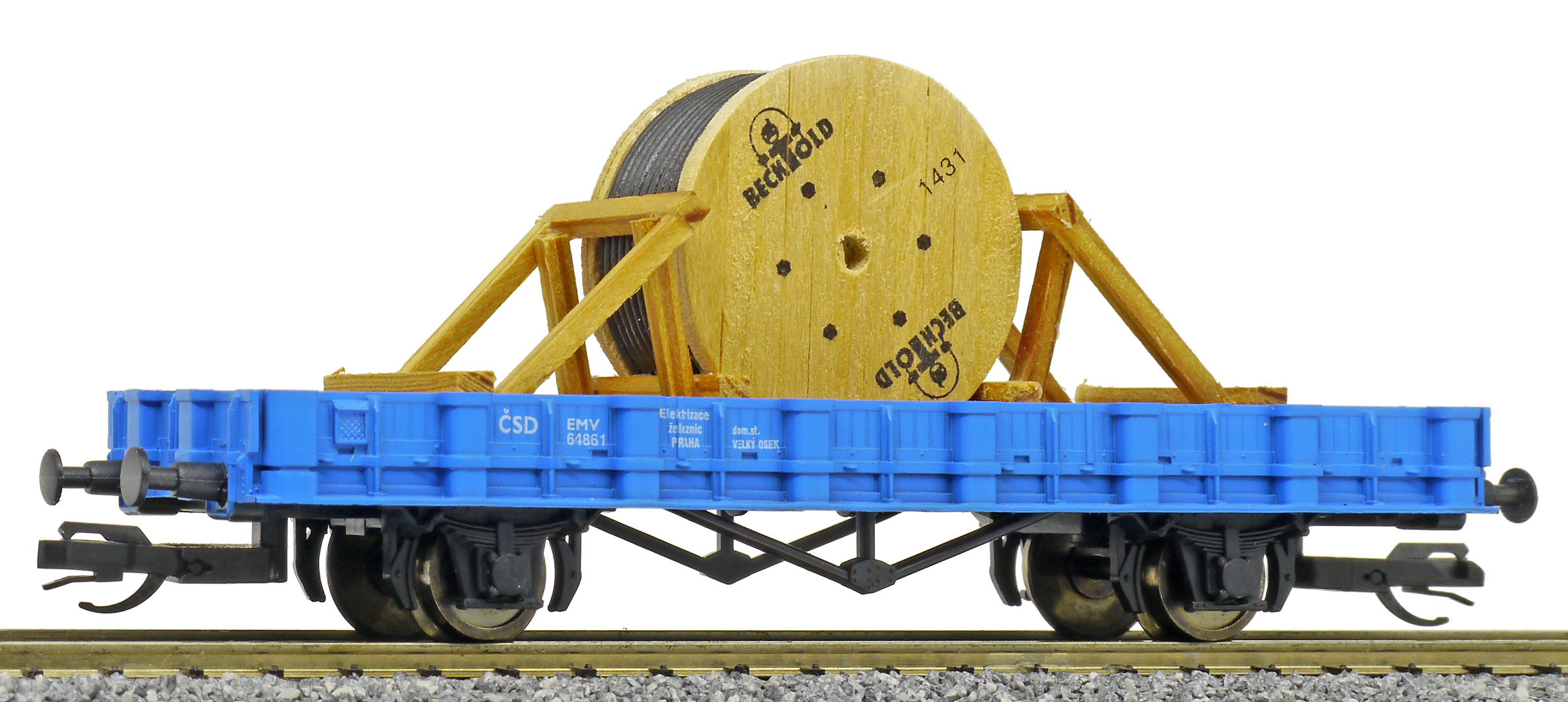 | nízkostěnný nákladní vůz modrý s nákladem bubnu kabelu „Elektrizace železnic“ |