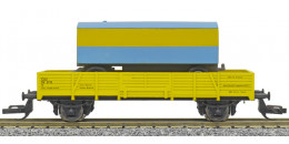 | nízkostěnný vůz žlutý s nákladem maringotky |